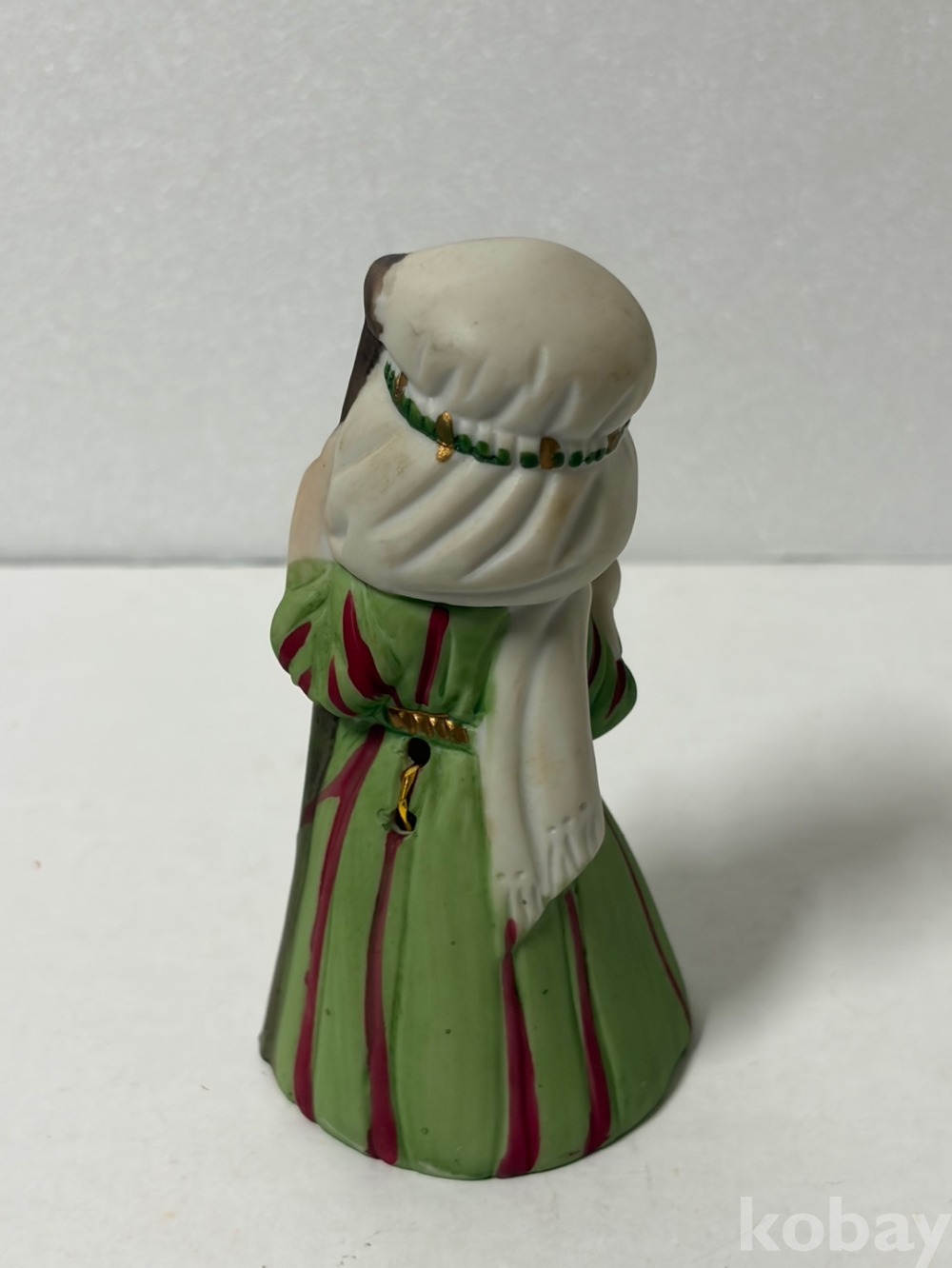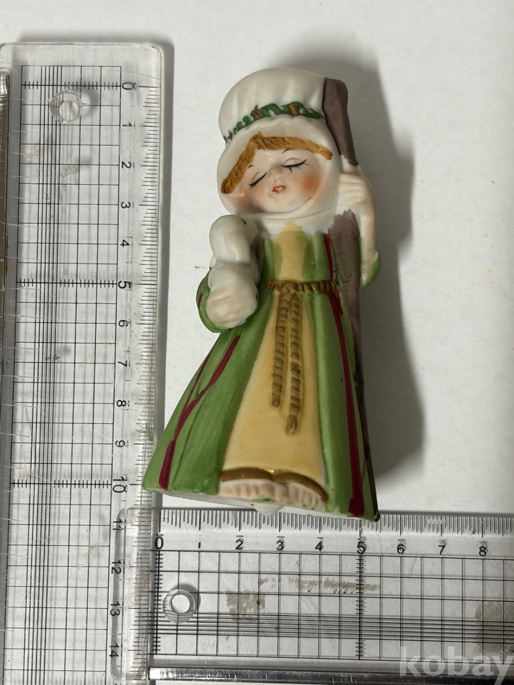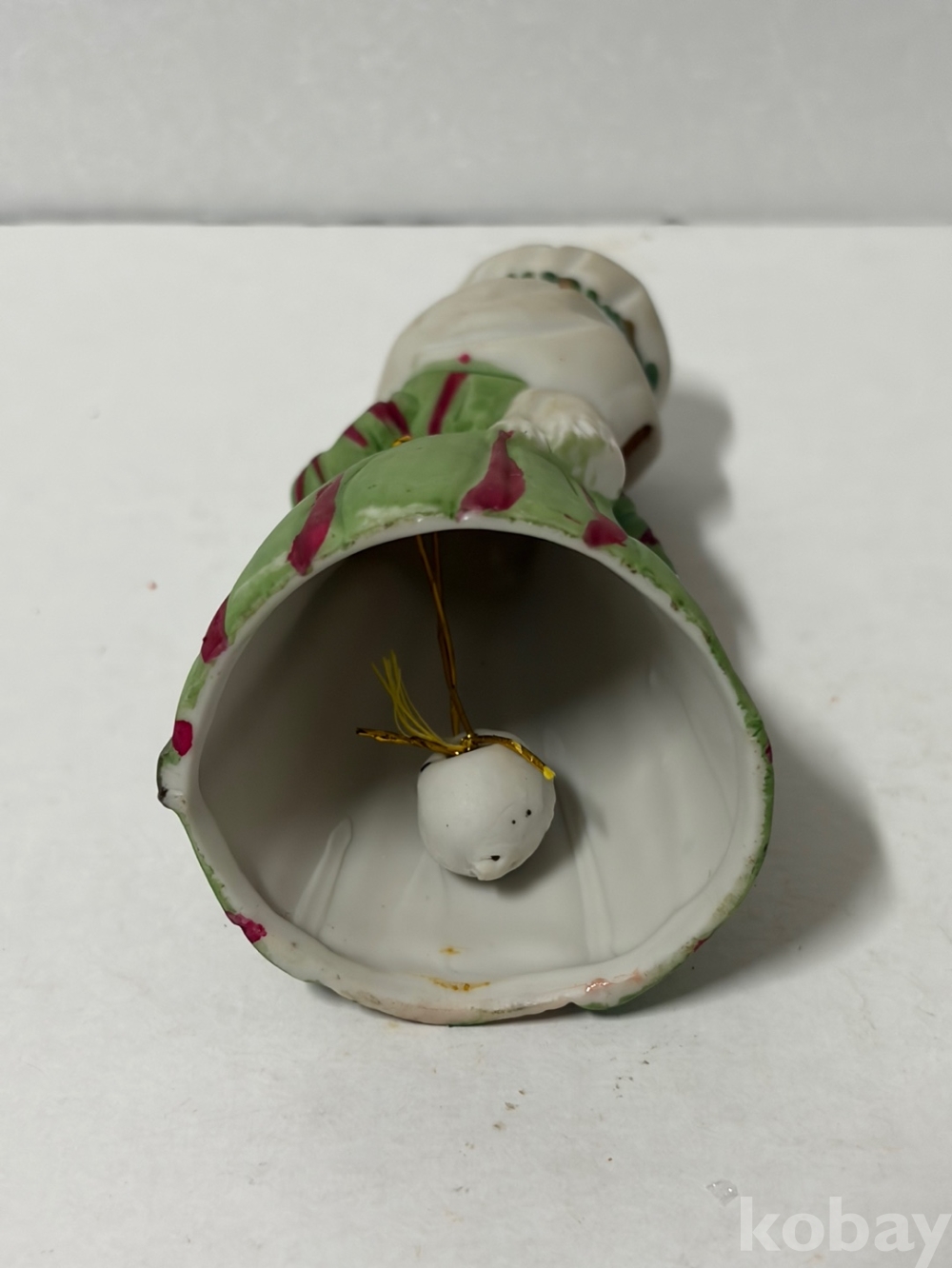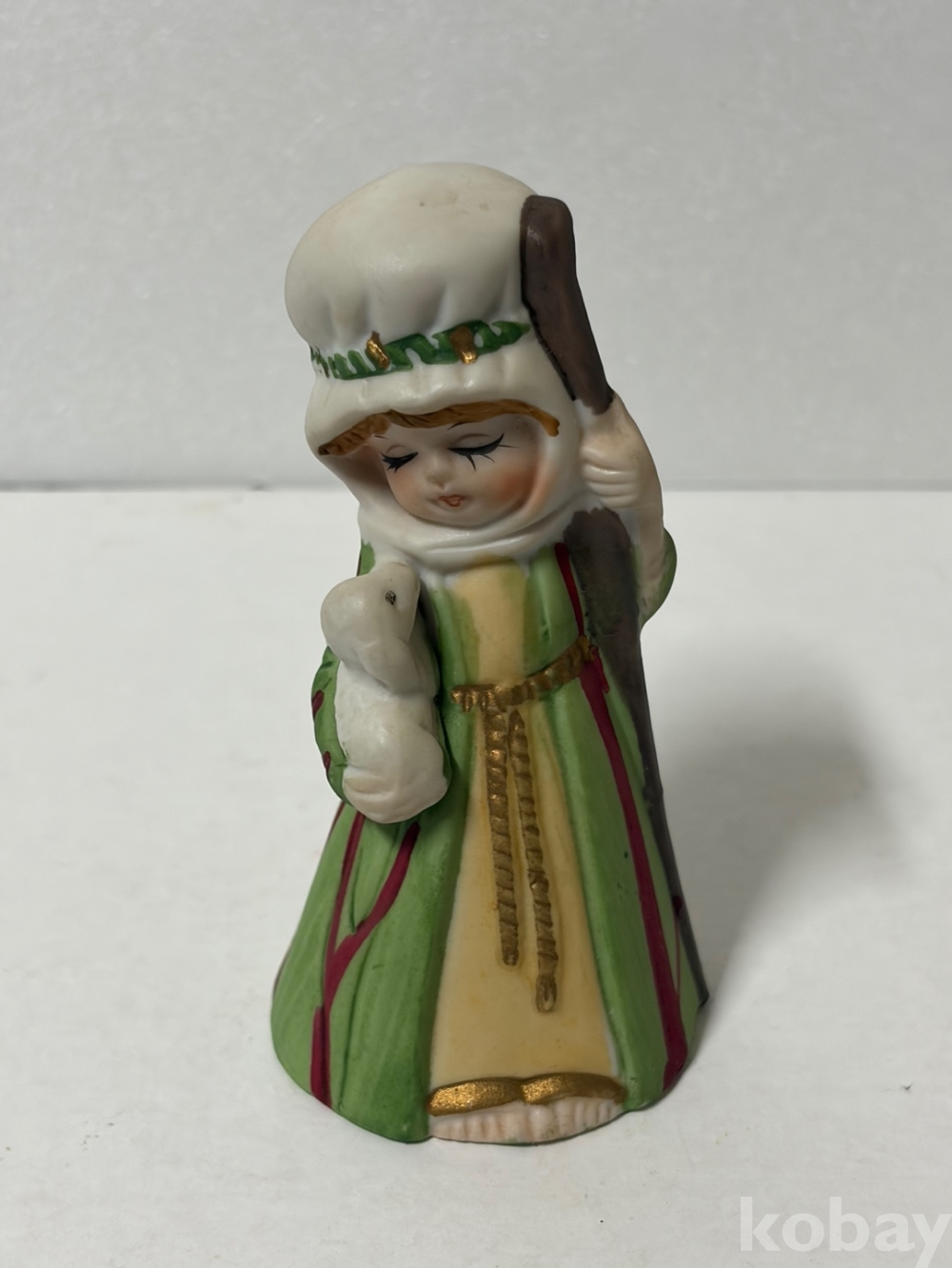 초록색과 빨간색 트림이 있는 옷을 입고 작은 흰색 양을 안고 있는 모습의 도자기 종입니다.