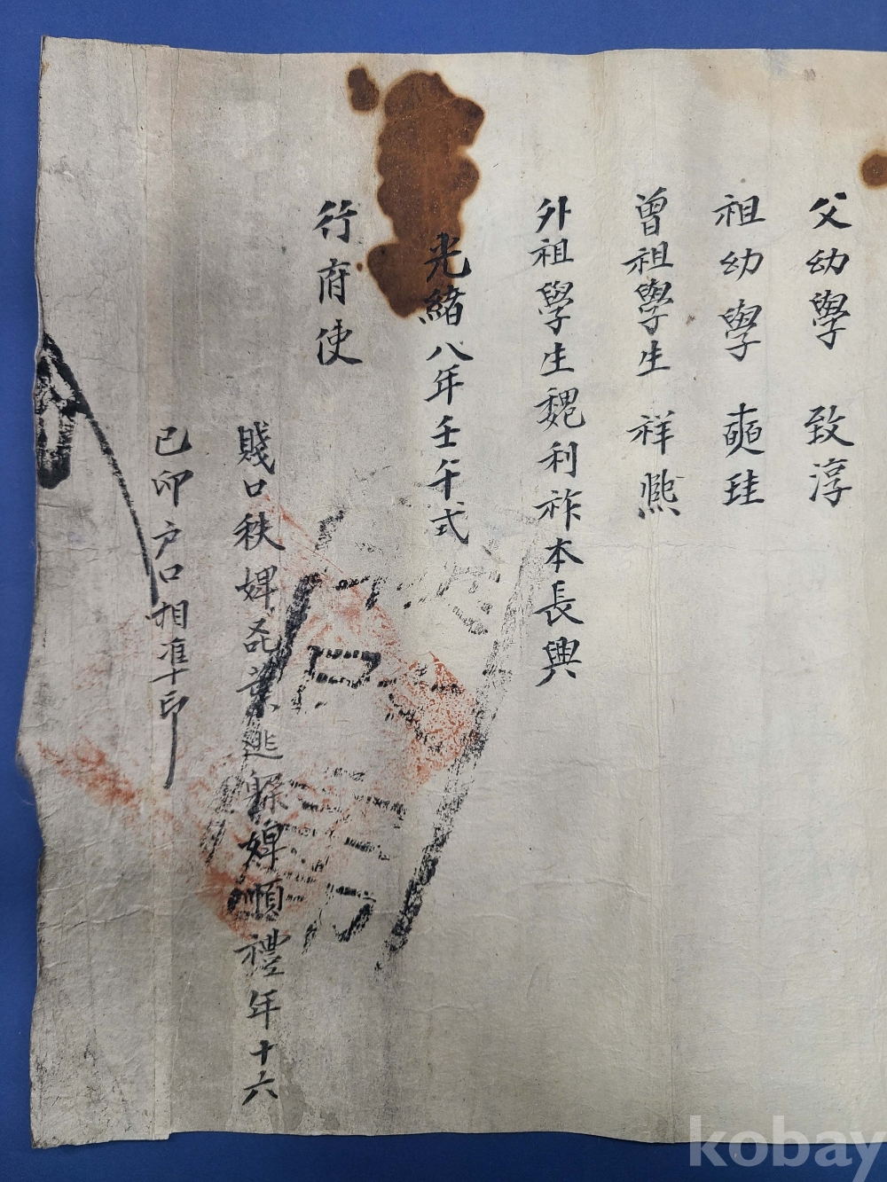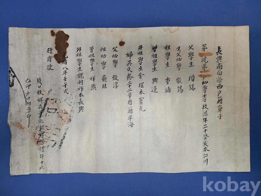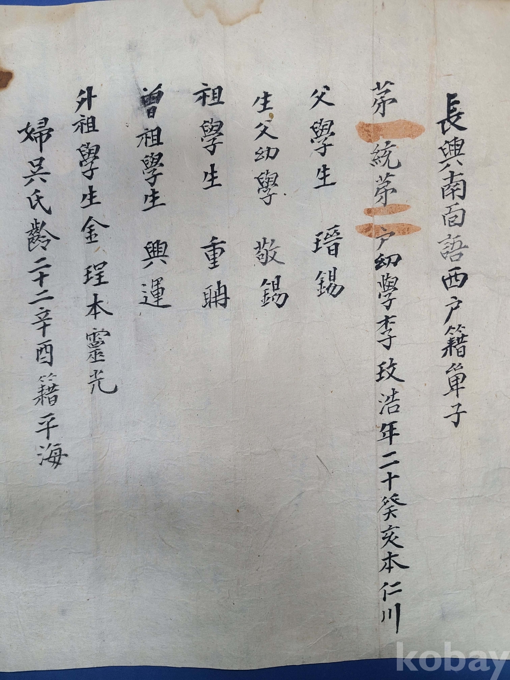 光緖8년(1882년) 長興南面語西 戶籍單子/우측부 일부 탈락된 것으로 보인다