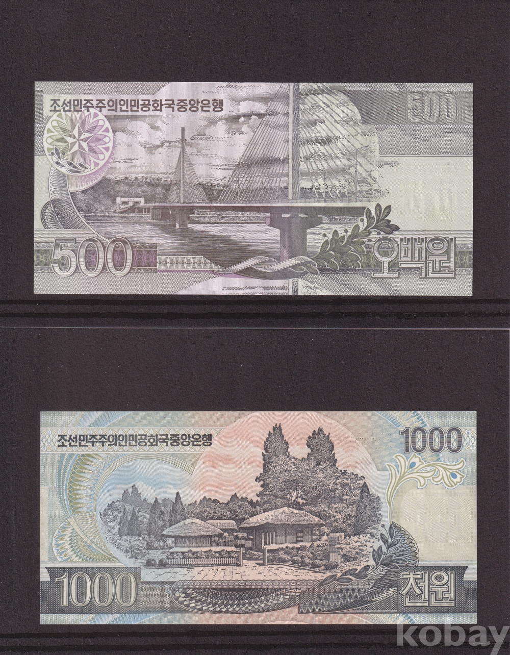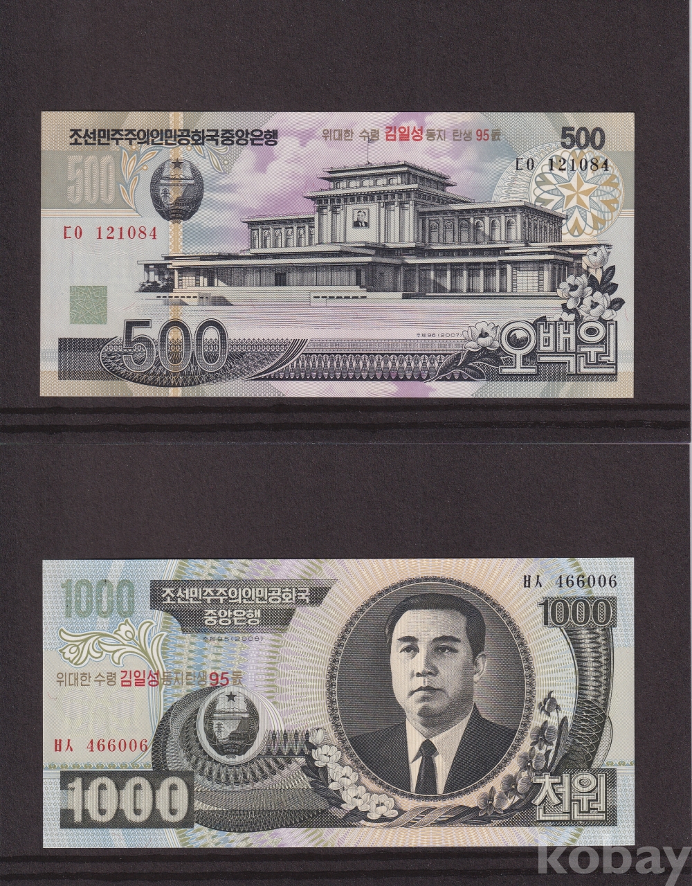 - 윗동네 2007년 김일성 동지 탄생 95돐 기념 오백원/천원 미사용 지폐 - 2장 일괄