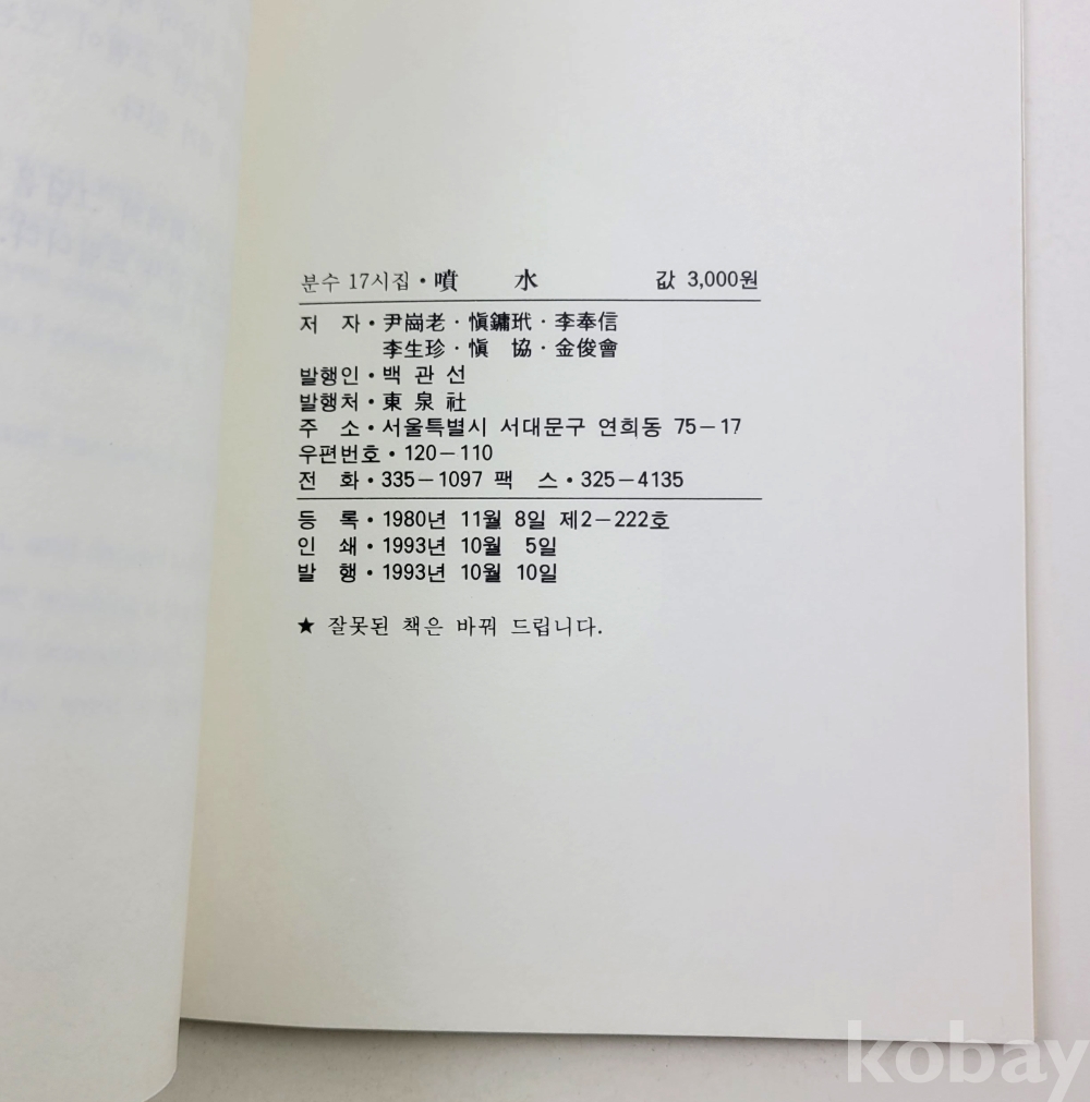 물 품 명 | 분수 '93 / 이봉신 외 5인 / 분수 17시집 / 1993년 초판 / 동천사 |