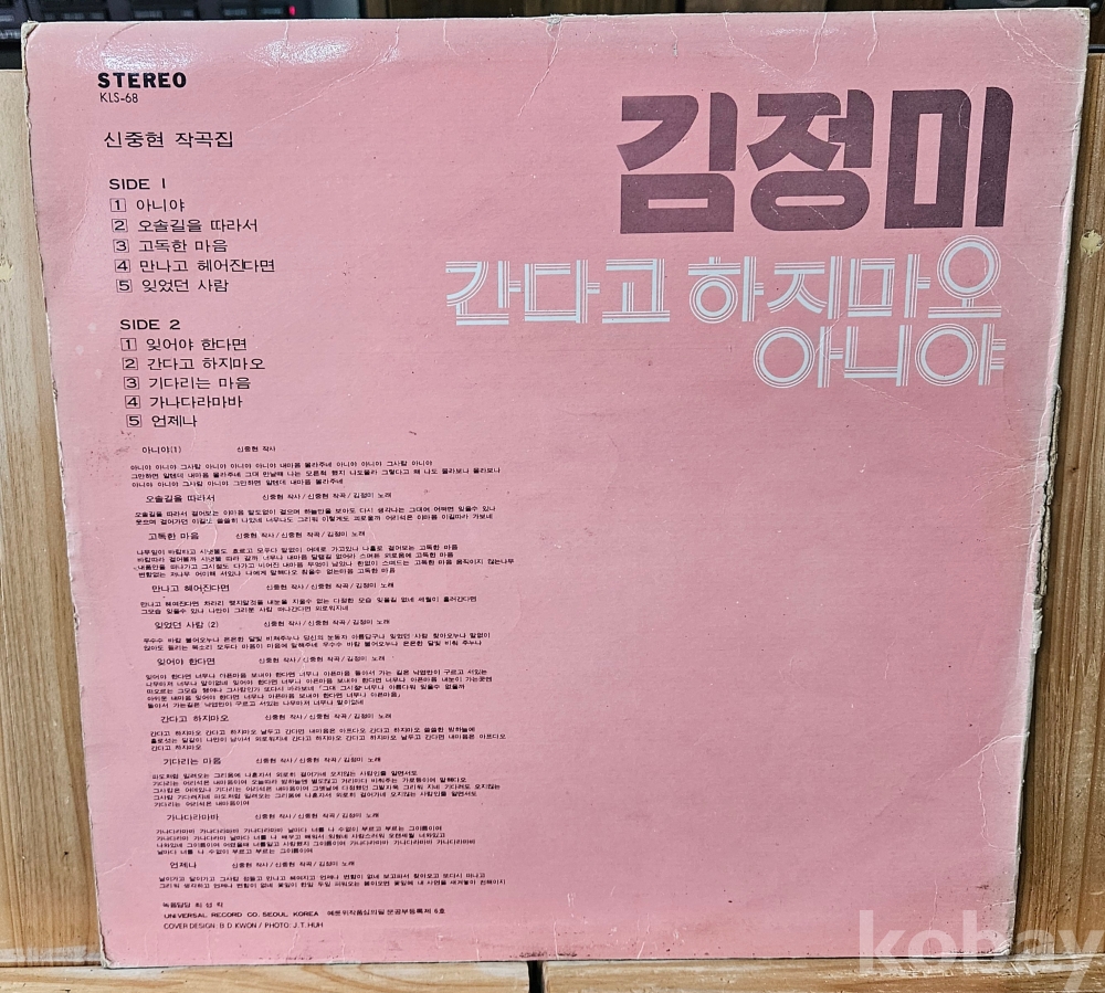락의 대부 신중현 사단의 대표 여가수중 한분인 [ 김정미 ] 가수의 대표곡인 [ 간다고 하지마오 / 아니야 ] 노래가 수록된 대표 음반 입니다.