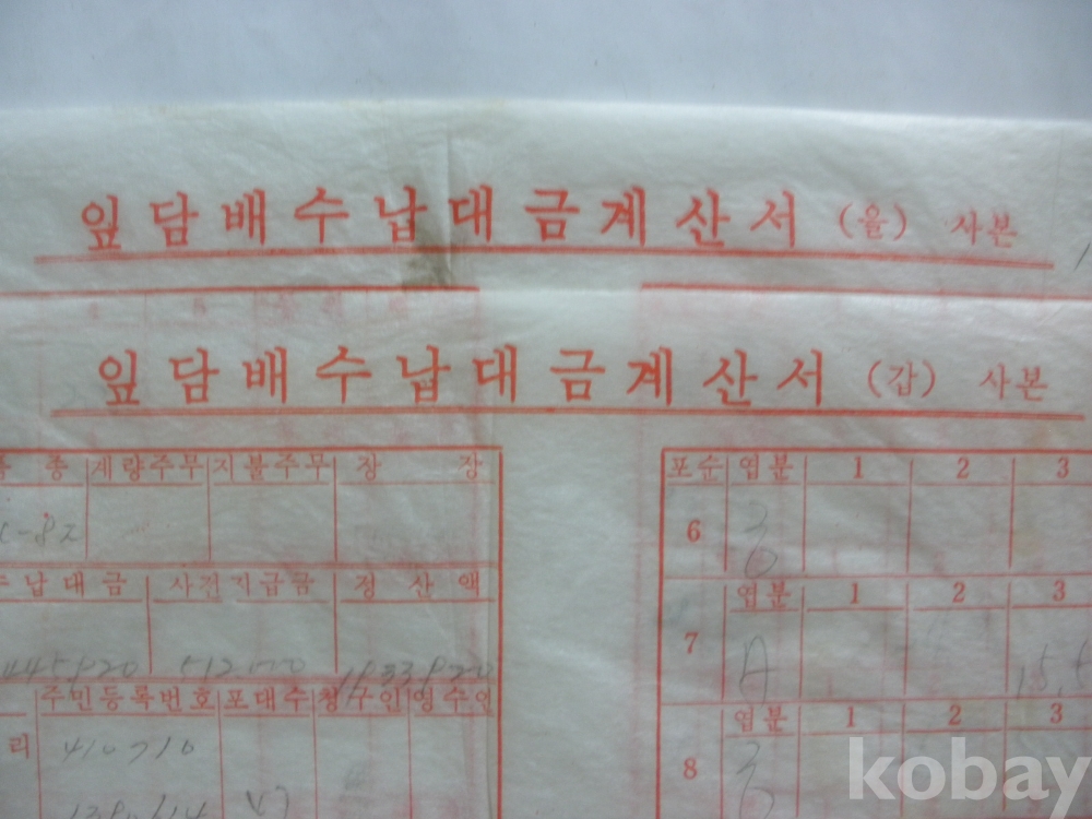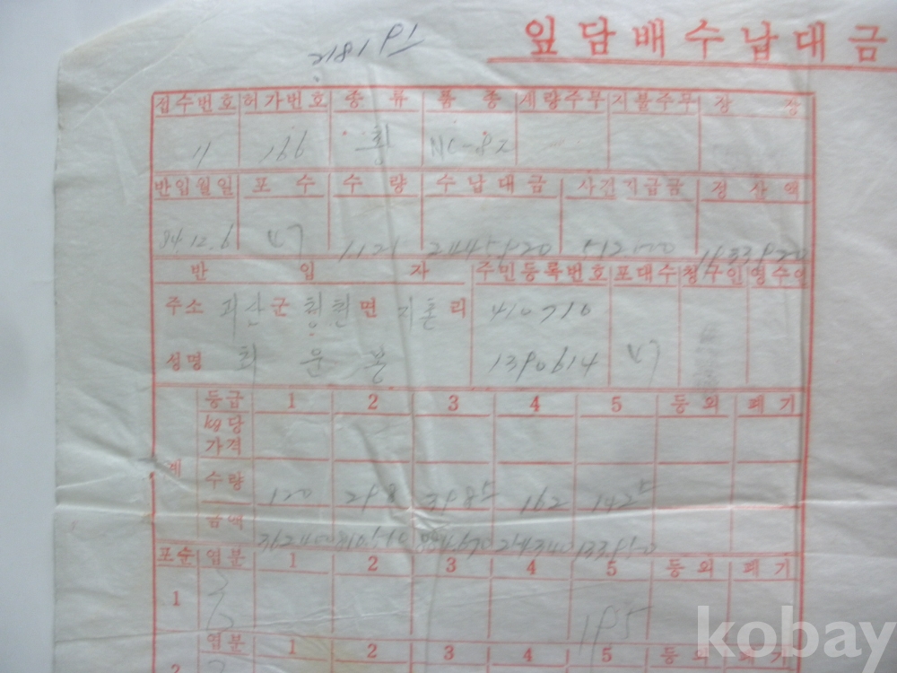 잎담배 수납대금 계산서 - 2매일괄 (1984년, 괴산군 청천면)