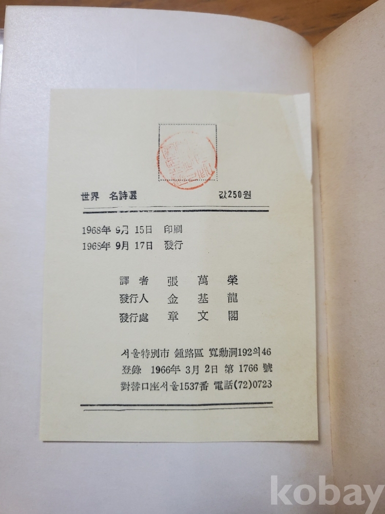세계 명시선 - 기다림, 장만영 벙역, 1968년, 158쪽, 상태 상,