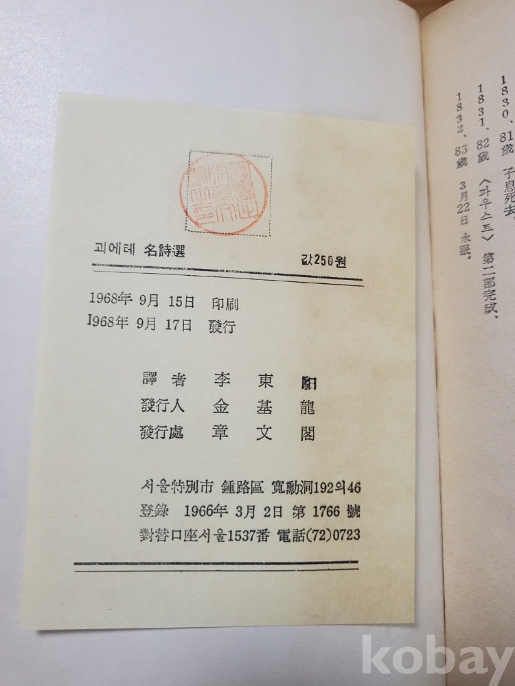 괴에테 명시선 - 사랑의 노래, 이동일 번역, 1968년, 142쪽, 상태 상,