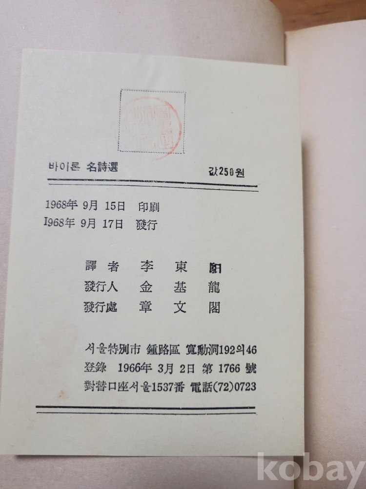 바이론 명시선 - 여정, 이동일 번역, 1968년, 143쪽, 상태 상,