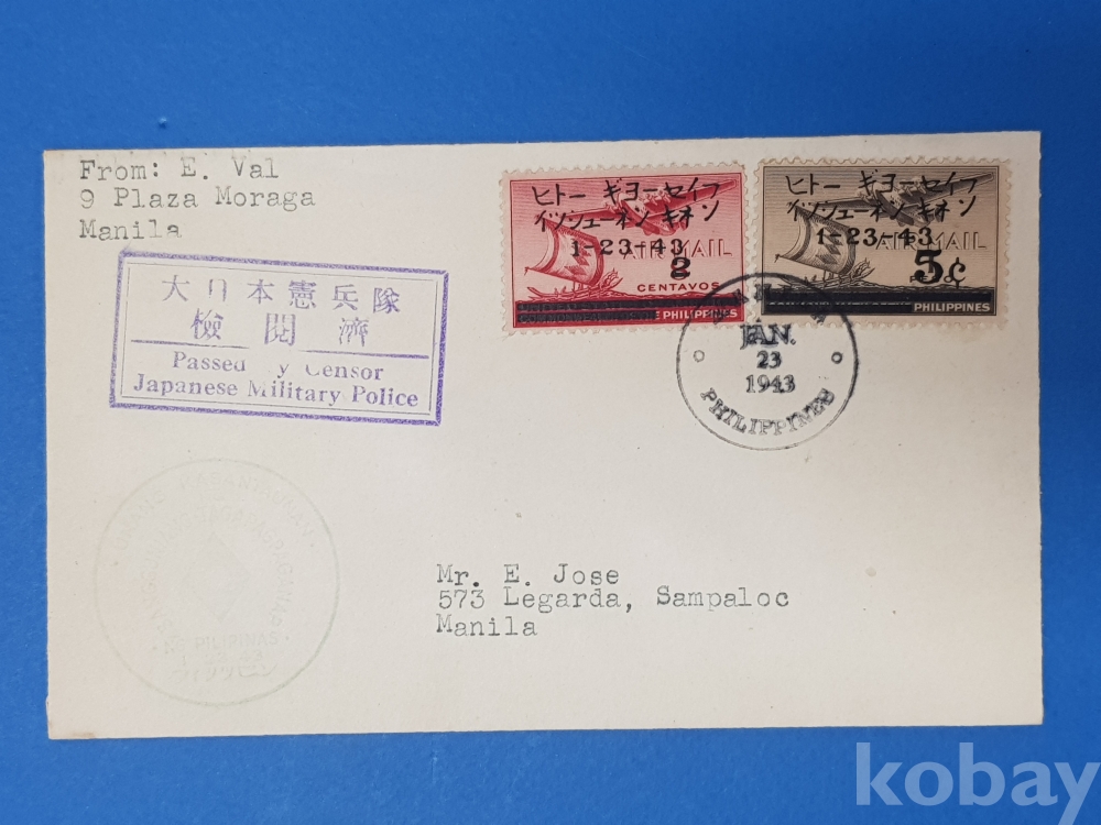 **** 필리핀 마닐라, 일본군 검열 소인분/1943.1.23/우표2매 첩부