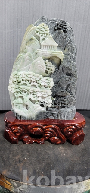 k-33.천연옥으로정교하게깍아만든 산수문양 장식품(통나무로깍은좌대포함)