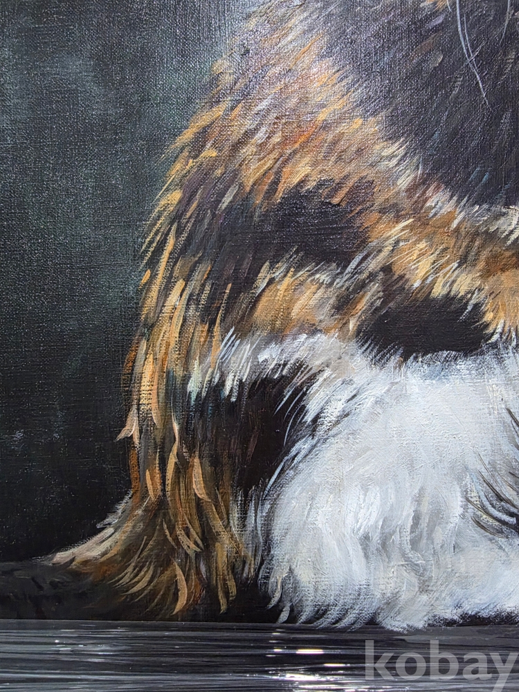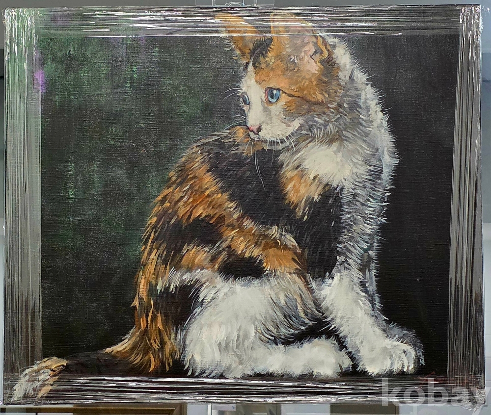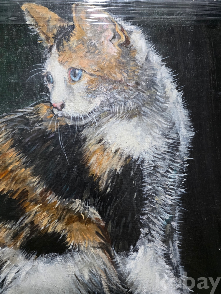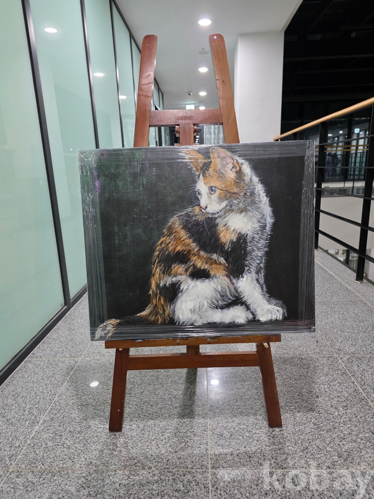 어두운 색조의 배경 위에 삼색 고양이가 화면 중심에 배치돼 있으며, 몸을 비틀어 고개를 돌린 자세가 포착돼 있다. 짧고 반복적인 붓질로 털의 결이 촘촘하게 표현돼 있고, 흰색과 갈색, 검은색의 대비로 형태가 분명하게 드러난다. 배경은 단순한 색면 처리로 구성돼 있어 대상이 화면 전면에서 자연스럽게 강조된다.