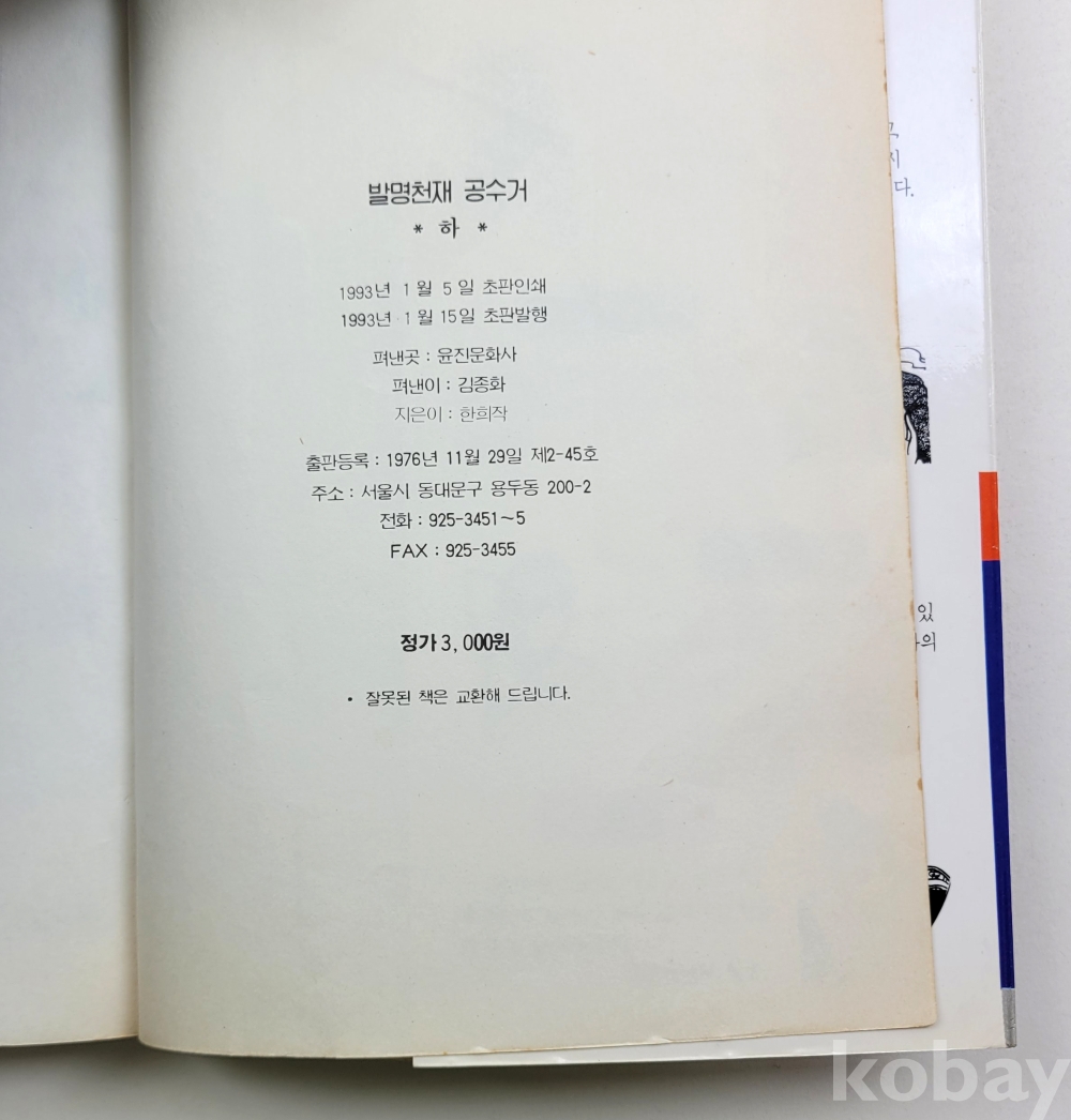 물 품 명 | 한희작 / 발명천재 공수거(하) / 명랑만화 월드코믹북스 / 1993년 초판 / 윤진만화사 |