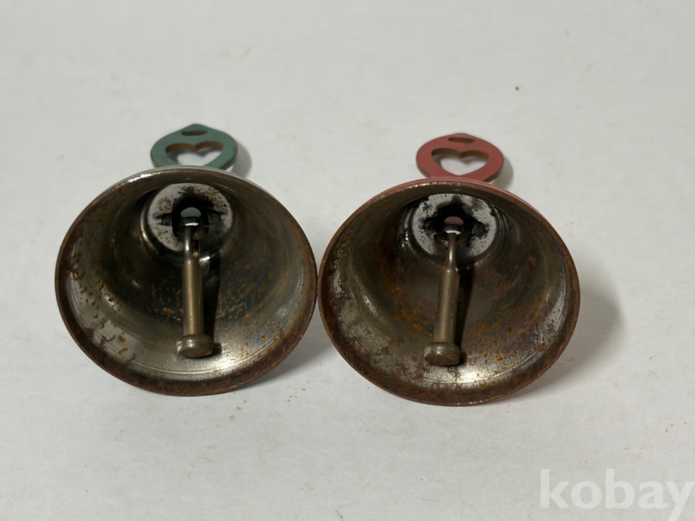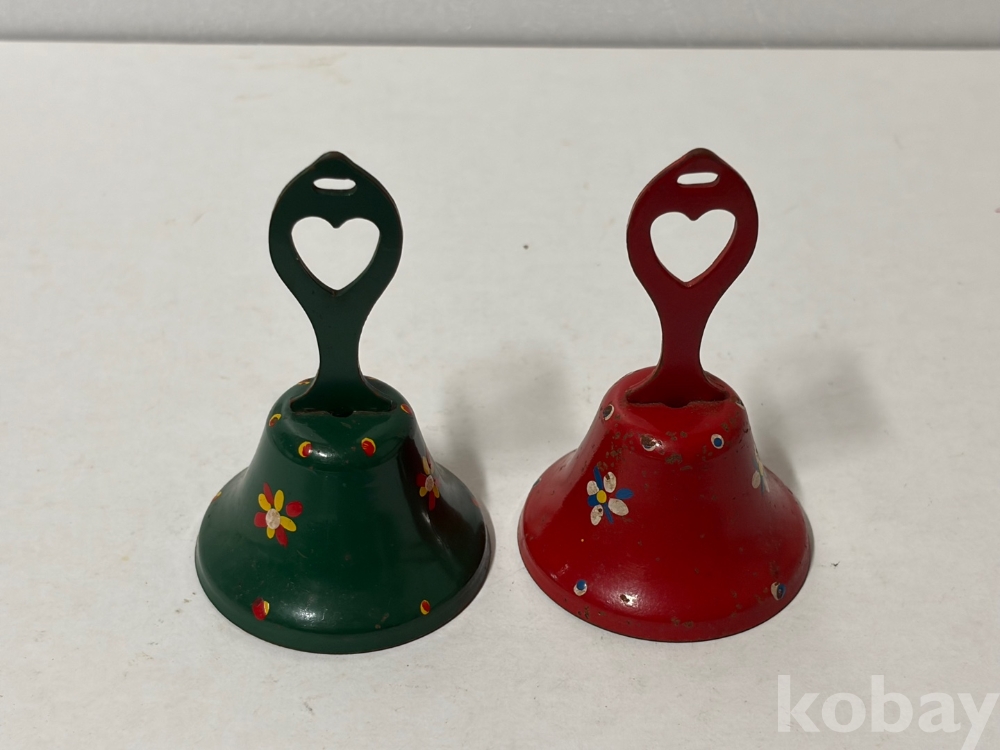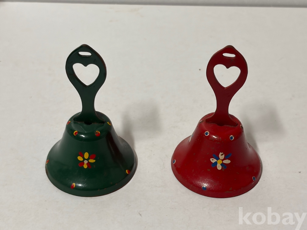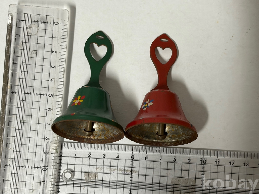 하트 모양 손잡이가 달린 녹색과 빨간색으로 페인트칠된 금속 종입니다.