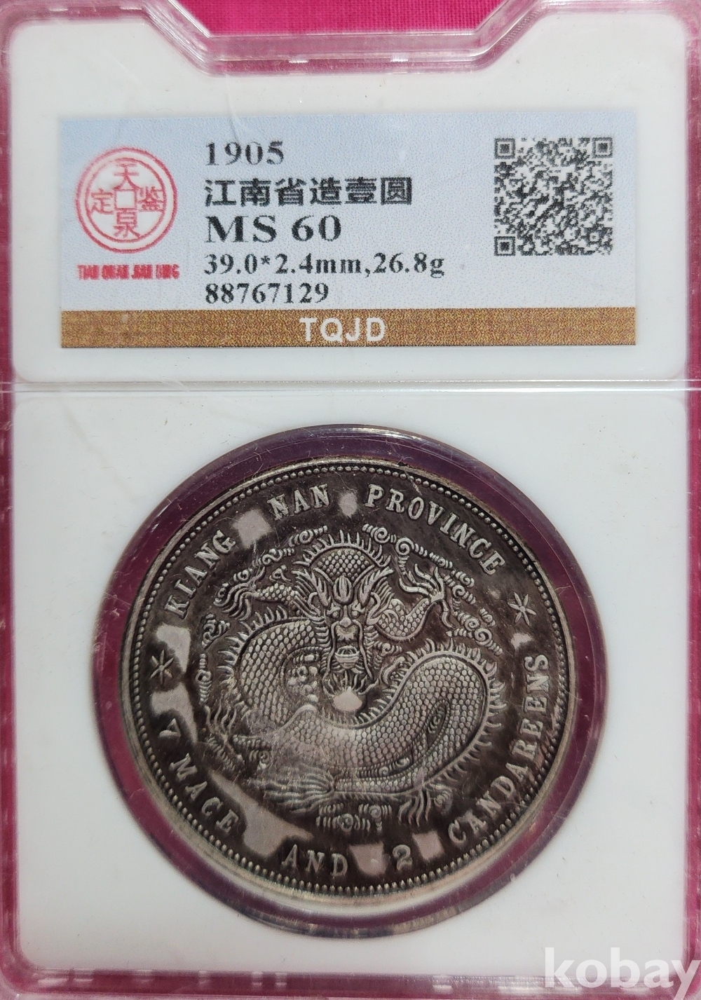 1905년 큐알코드(QR CODE)가 함께하는 은색 광서원보 (光緖元寶) 화패로 밀봉된 상태입니다,