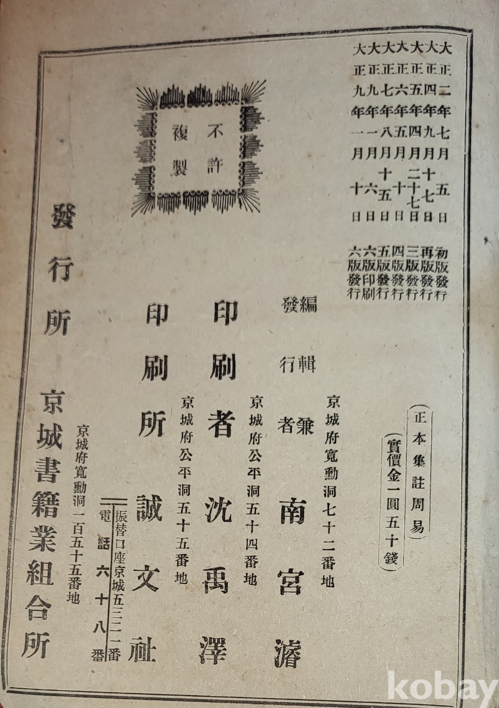 대정구년( 1920년) 발행된 정본 집주주역(正本 集註周易)입니다,