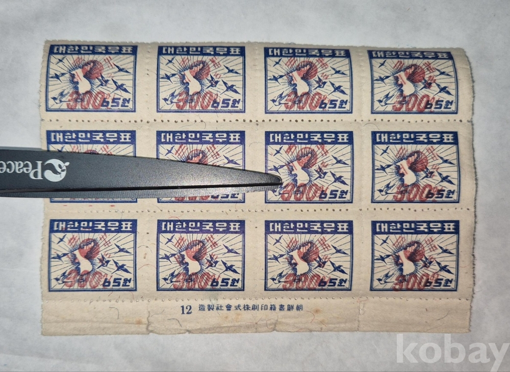 1951년 발행한 전시첨쇄 '지도' 보통우표 300/65원 12매 명판부 블럭 입니다.