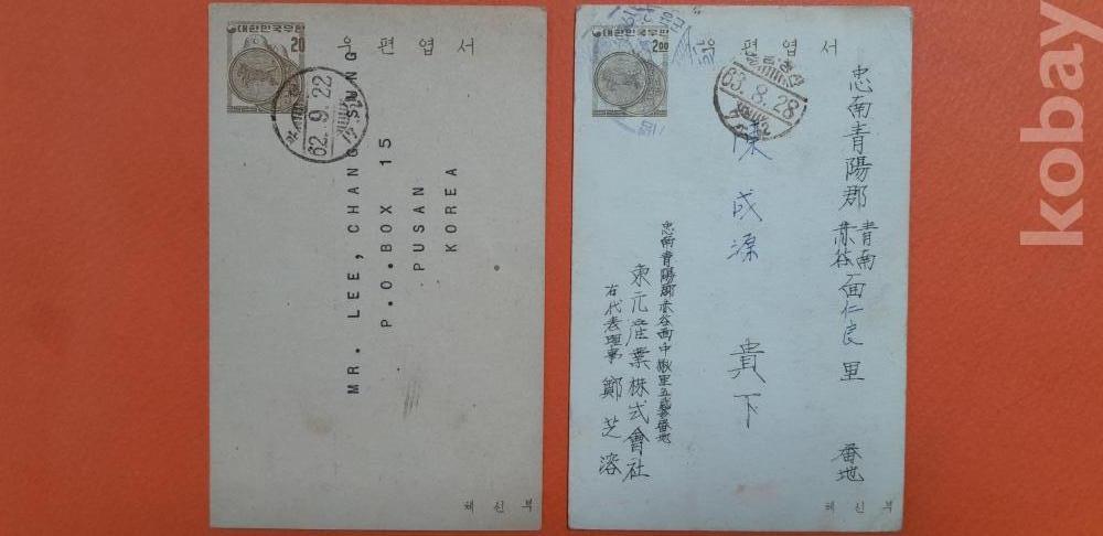 부산 62. 9. 22 소인 등 실체봉피 2종 입니다.