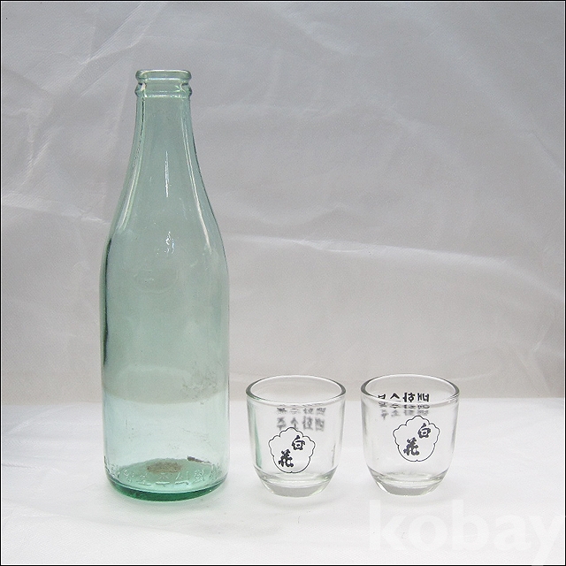 옛날 백화소주 양각 로고 2홉 소주병 + 백화 소주잔 2개 (1008)