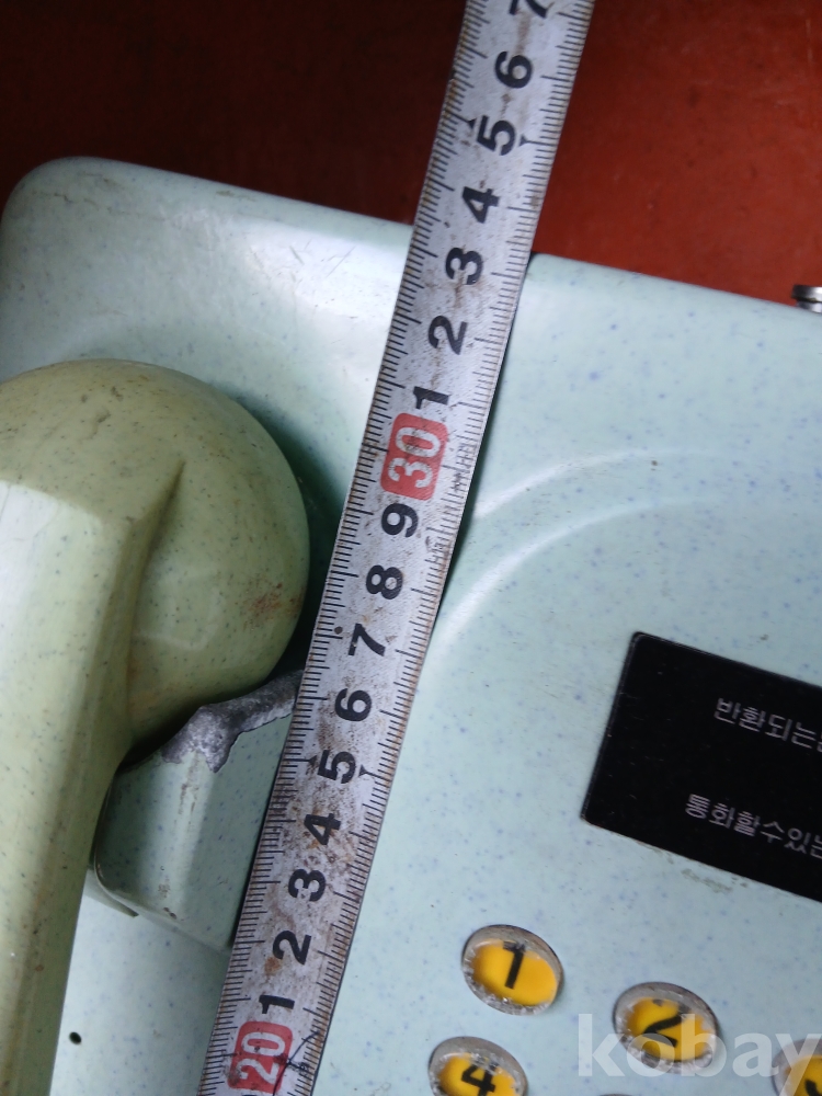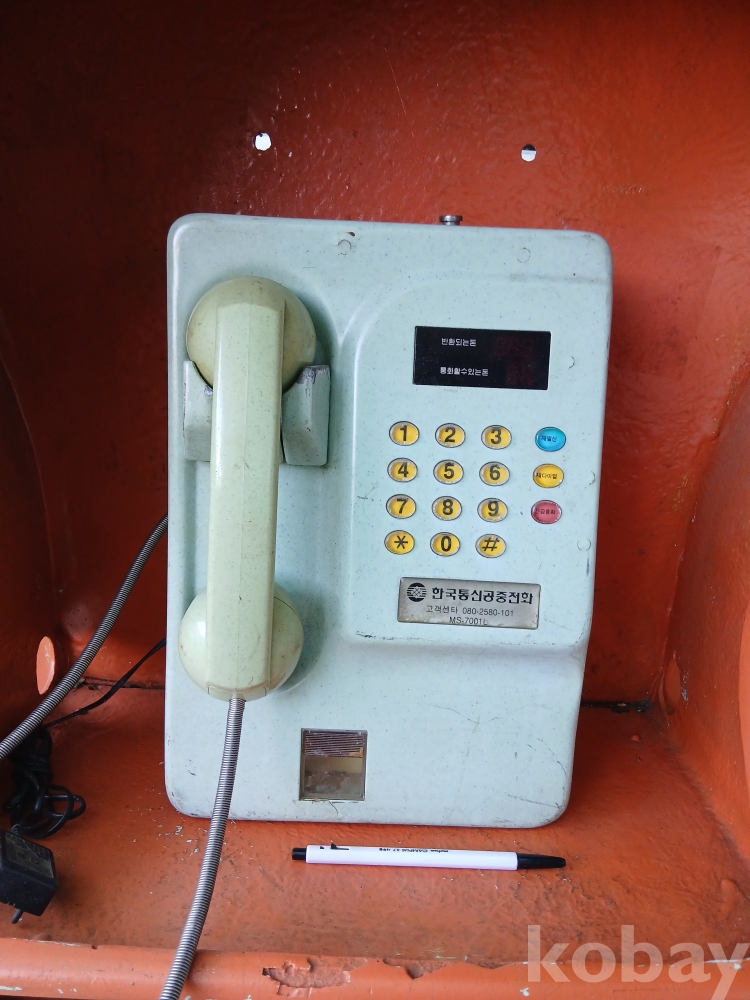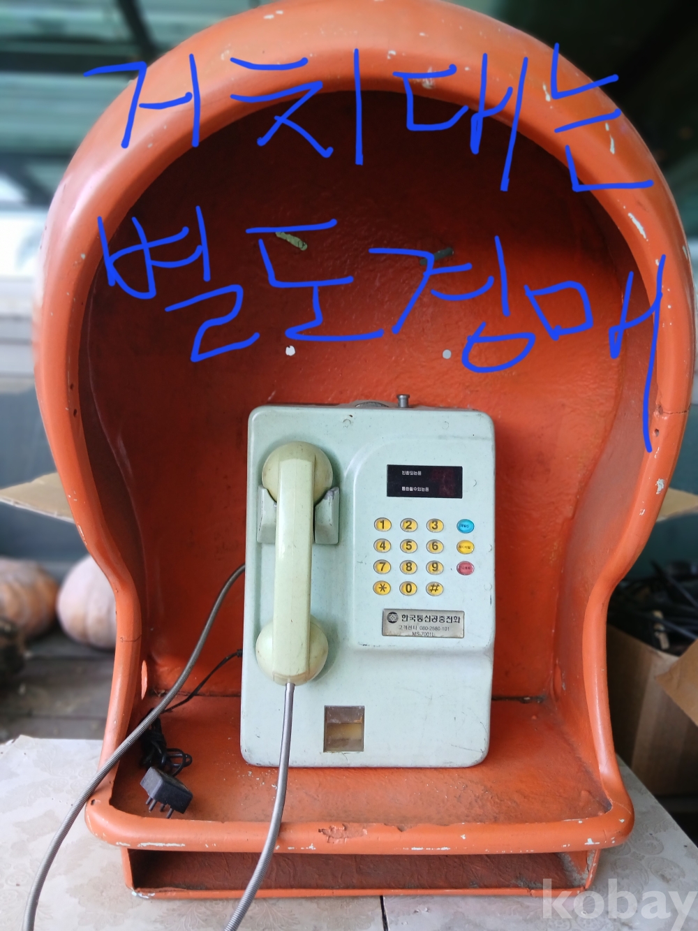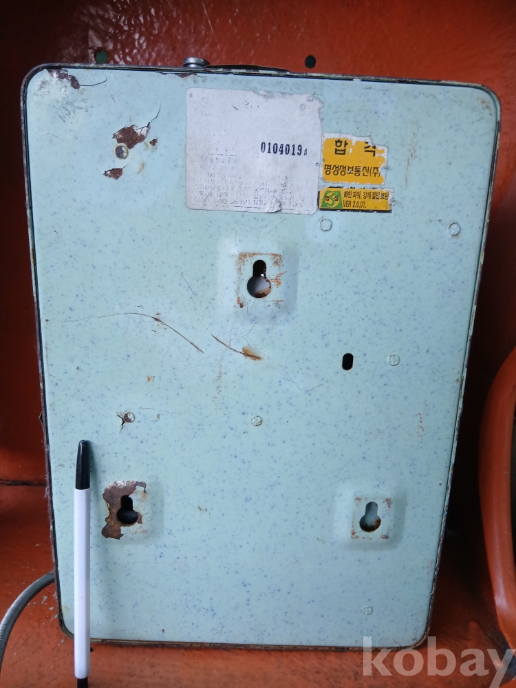 ☆ 송수화기 절단도난을 방지하기 위한 철재외피 전화선과 사각형의 단순디자인 그리고 상단부 동전투입구와 하단부 반환구를 구비하고 있으며 전면 중간부분에 운용사인 한국통신 명판과 뒷면 일측면에 제작자 명판이 보존되어 있습니다.