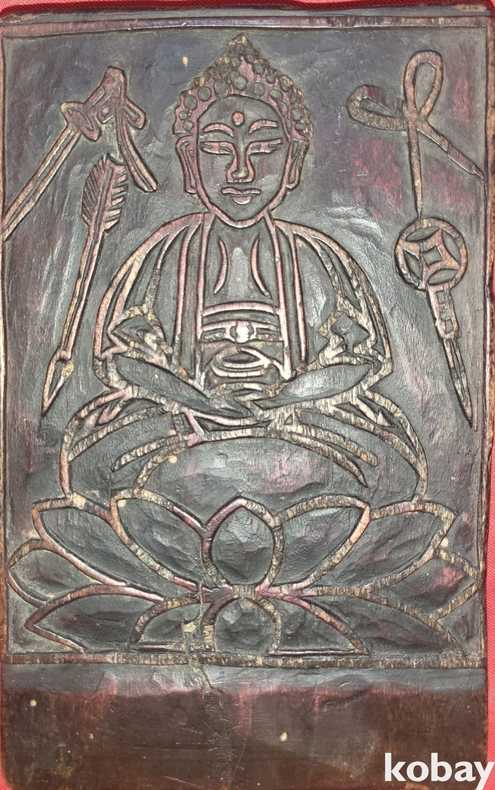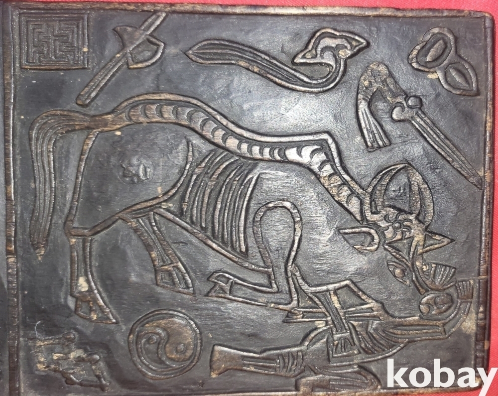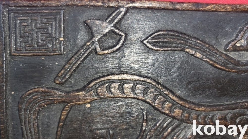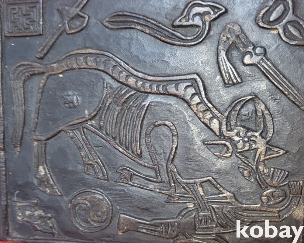 연화대 위 좌불과 가위 화살 도안으로 있으며 반대편에는 소(牛)와 구름 태극문양이 도안으로 새겨진