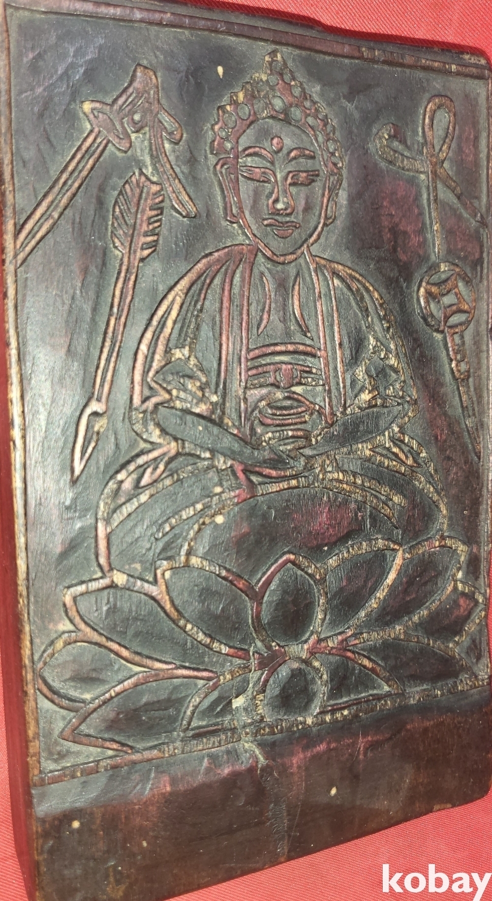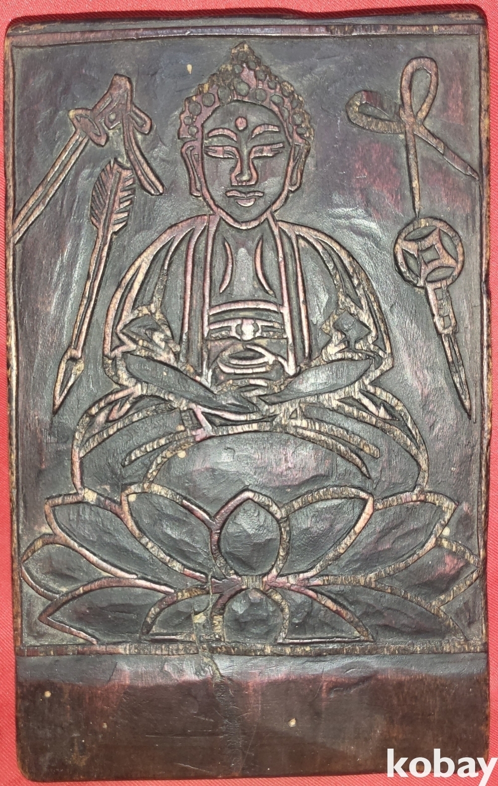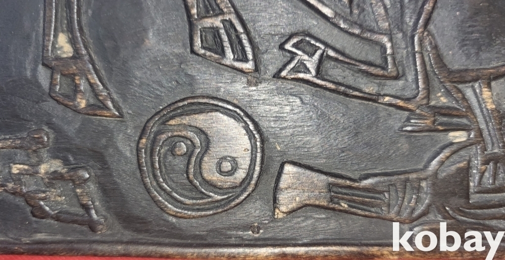 연화대 위 좌불과 가위 화살 도안으로 있으며 반대편에는 소(牛)와 구름 태극문양이 도안으로 새겨진