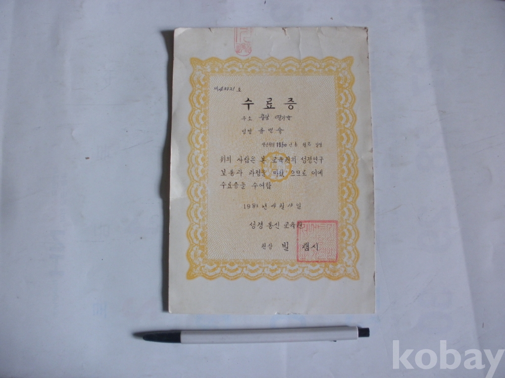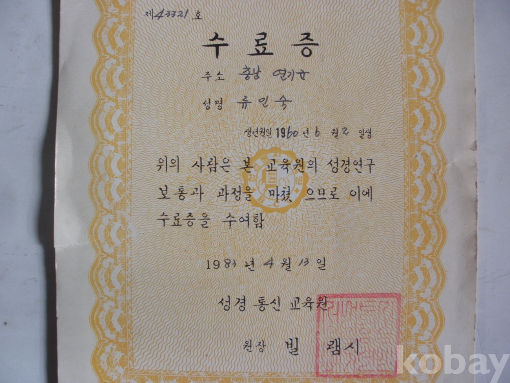 성경 통신교육원 - 수료증 (1983년, 충남 연기군)