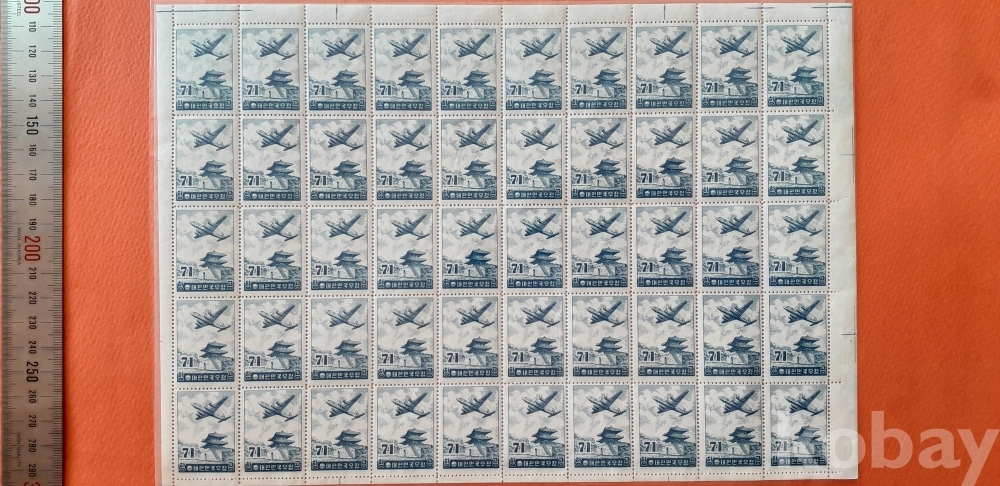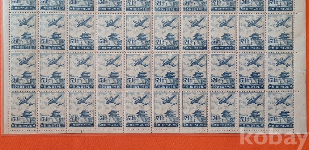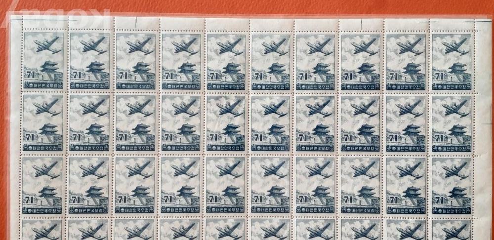 1954년 7월 1일 발행한 동대문 도안 항공 71환 50매 전지 입니다.