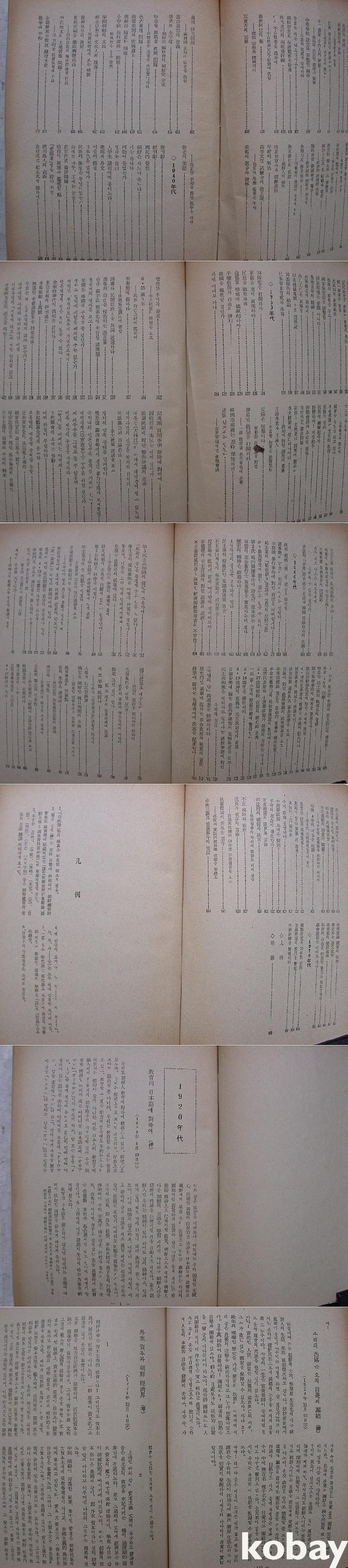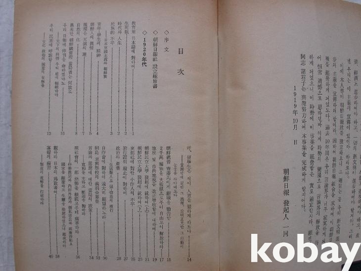 앞에 1919년 10월의 조선일보 발기인 일동의 조선일보사설립취지문이 있고 연도별로 <목차>가 있다.