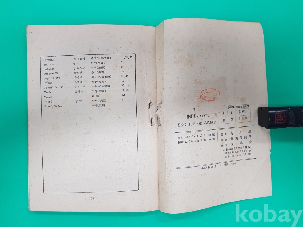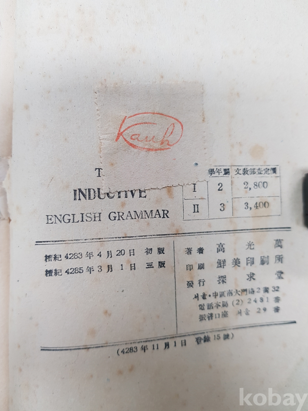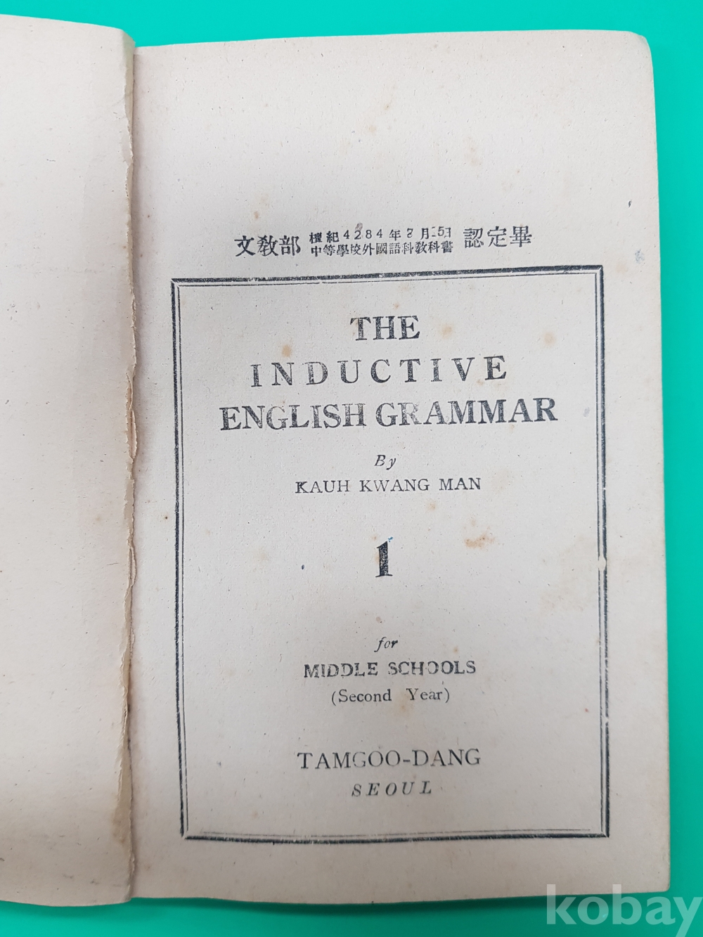 THE INDUCTIVE ENGLISH GRAMMAR 1/고광만.1952년 탐구당.108쪽/뒷표지 하단부 약간 탈락