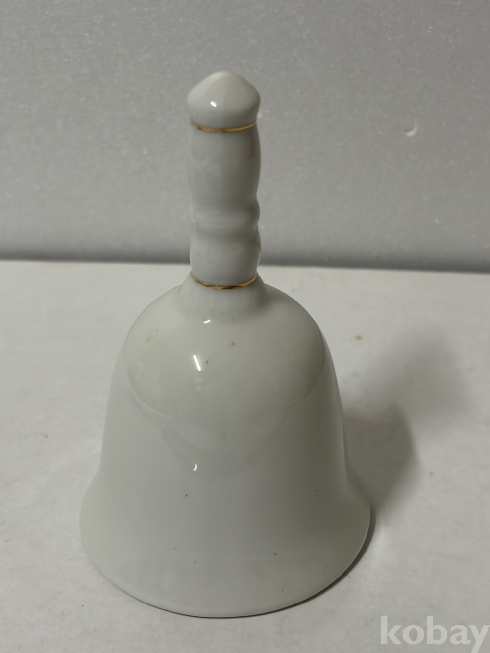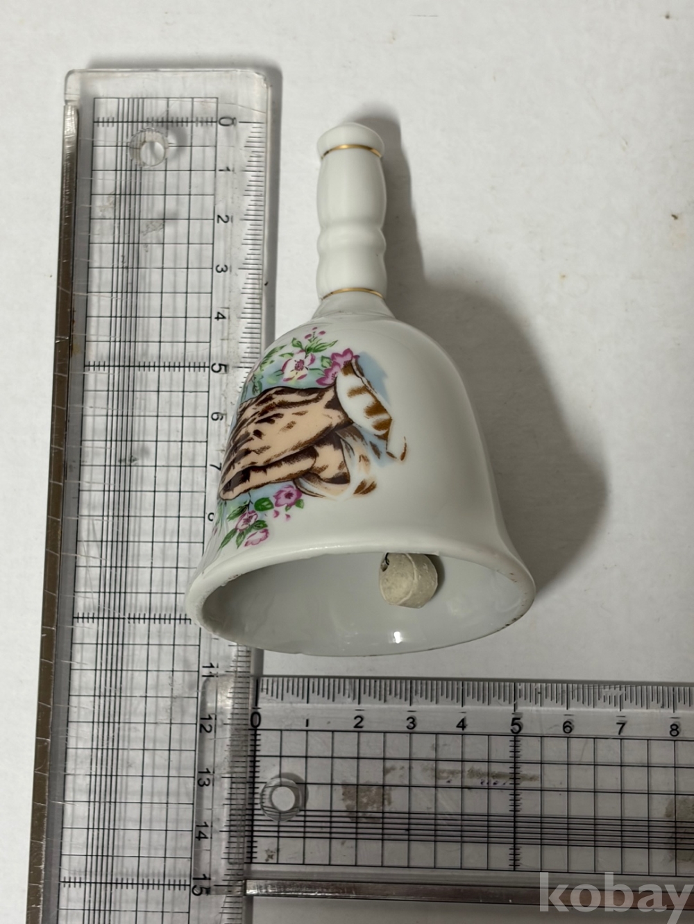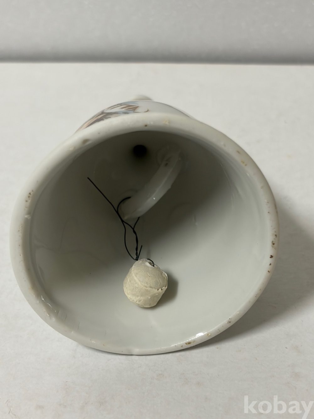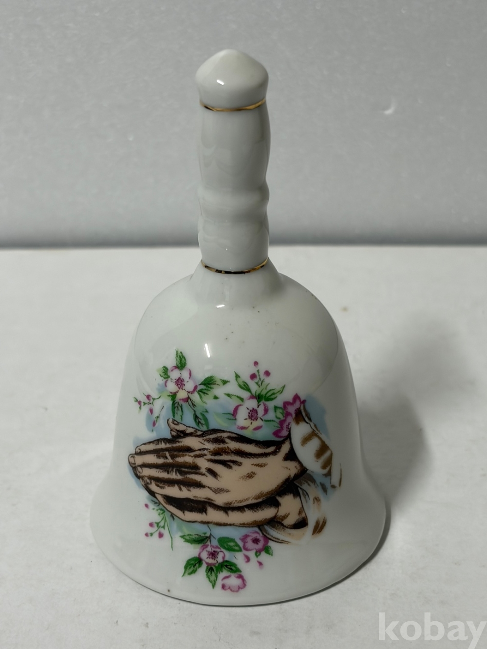 기도하는 손 그림이 있는 도자기 종입니다.
