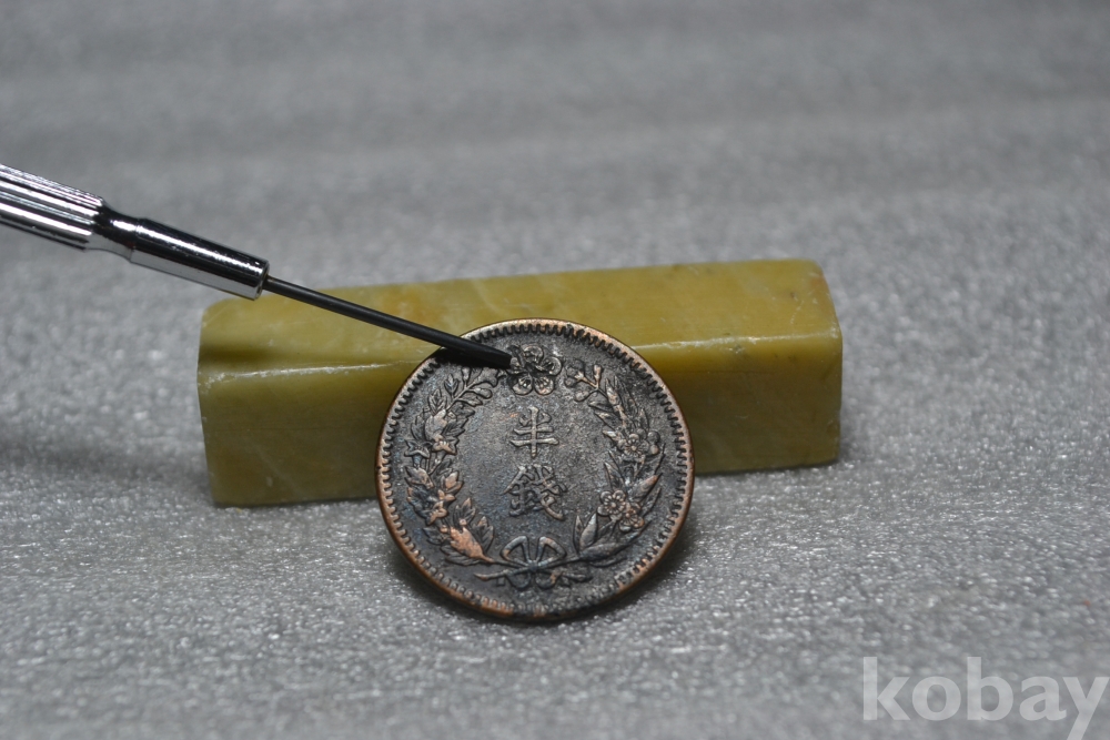 반전의 앞면부분 이화꽃 문양부분을 보시면 표면부에 작은 찍힘흔적이 1곳 있습니다. (검은핀으로 가르킨 부분 2번째 사진참조)