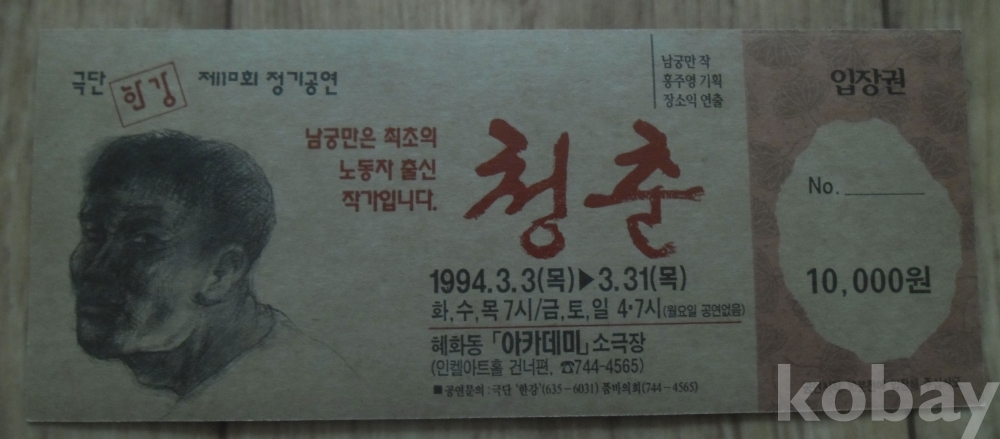 1994년 극단 한강 정기공연 청춘 공연 입장권