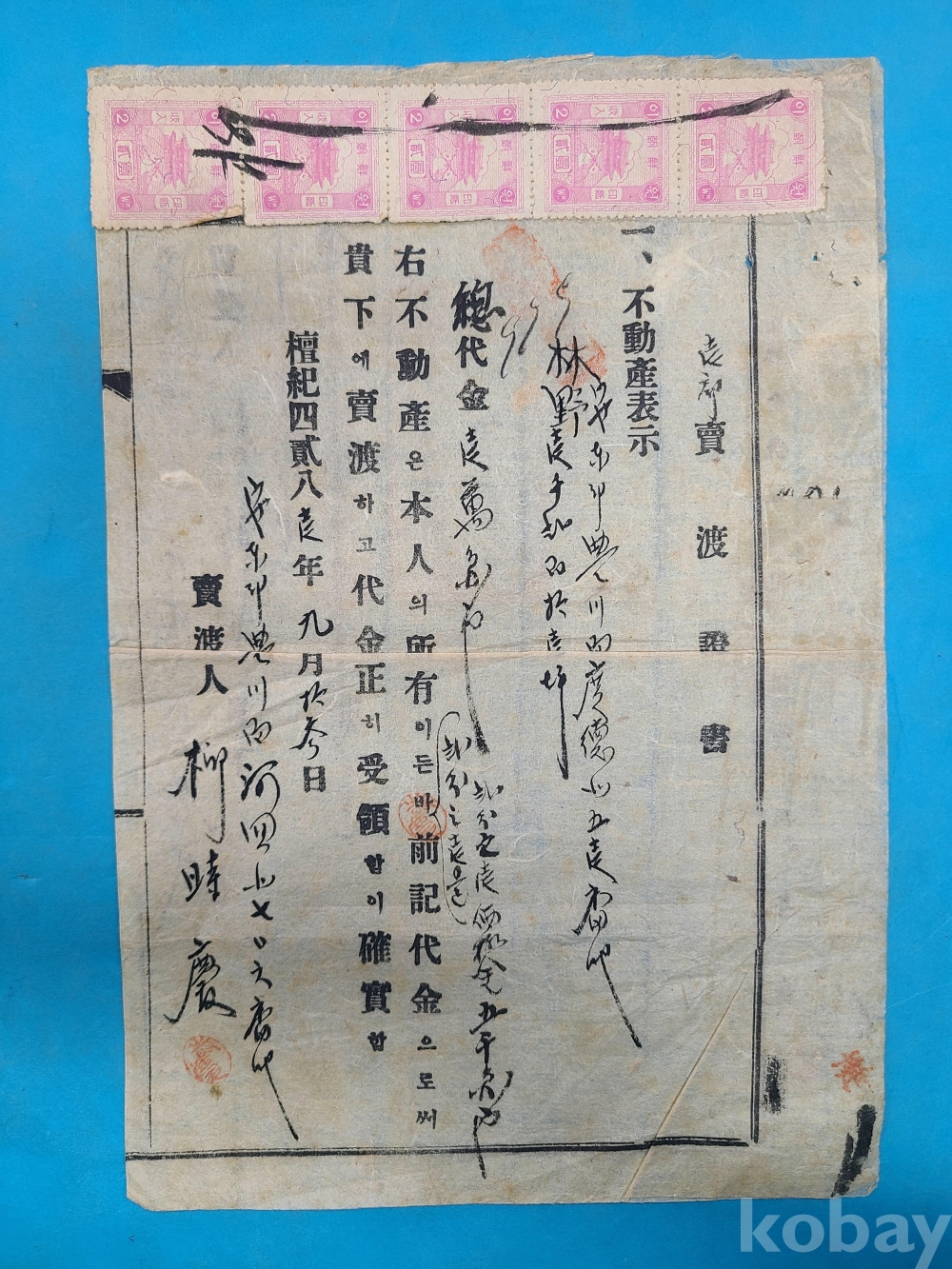 1948년 2원 수입인지 4매첩부 안동군 풍천면 매도증서