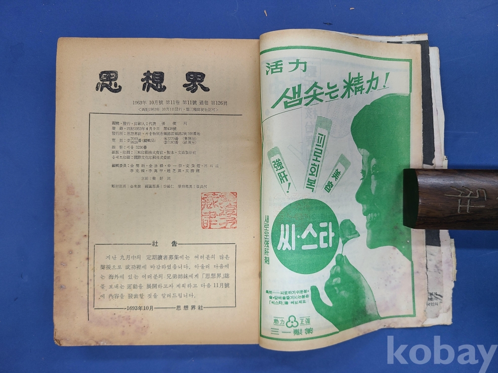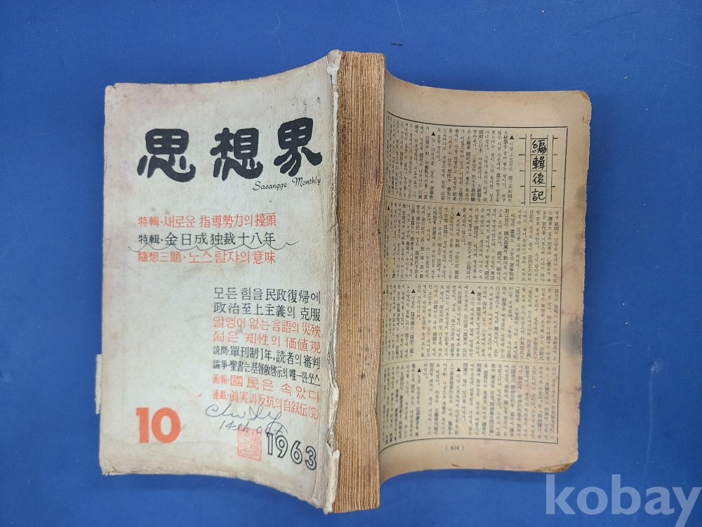 ▶사상계(1963년 10월호)/사상계사,424쪽/전체적으로 헐었고, 얼룩있음,뒷표지 낙장임