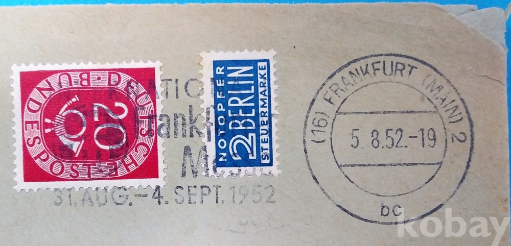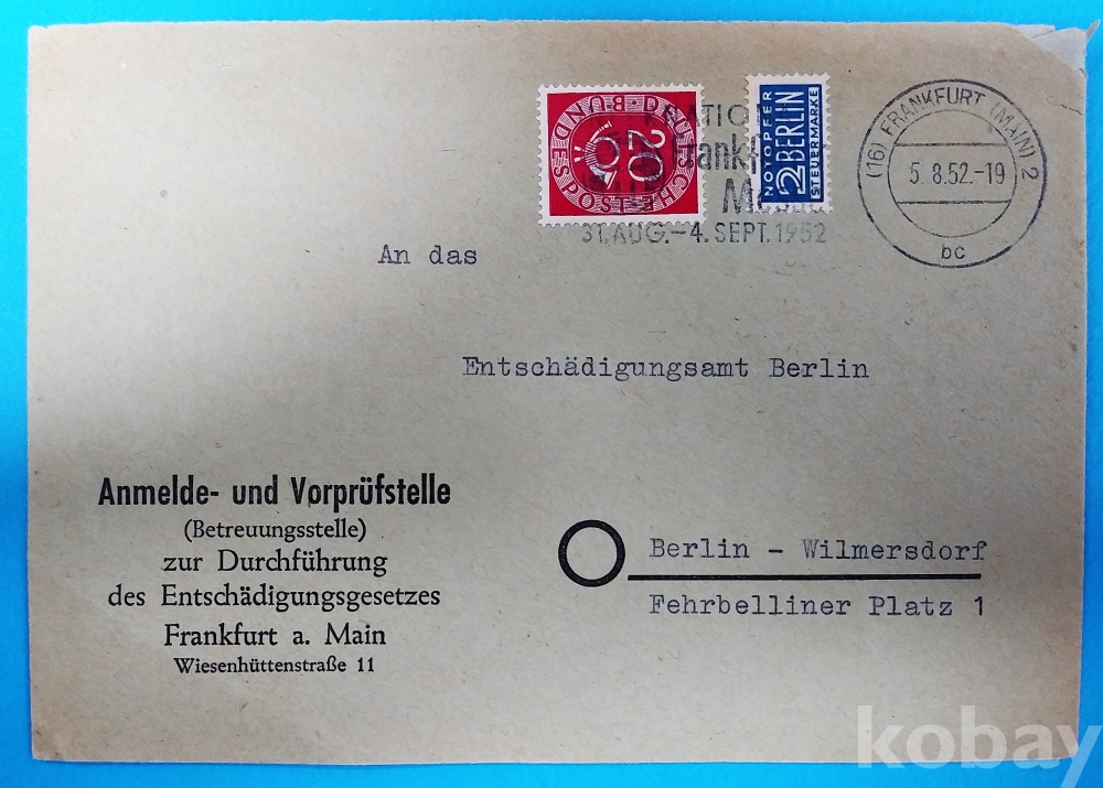 [흥미우표] 1952년 독일 베를린 강제부가금우표 첩부 실체봉투