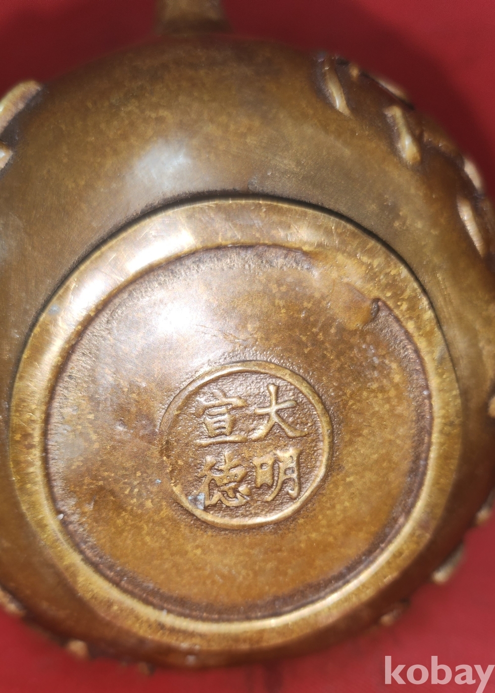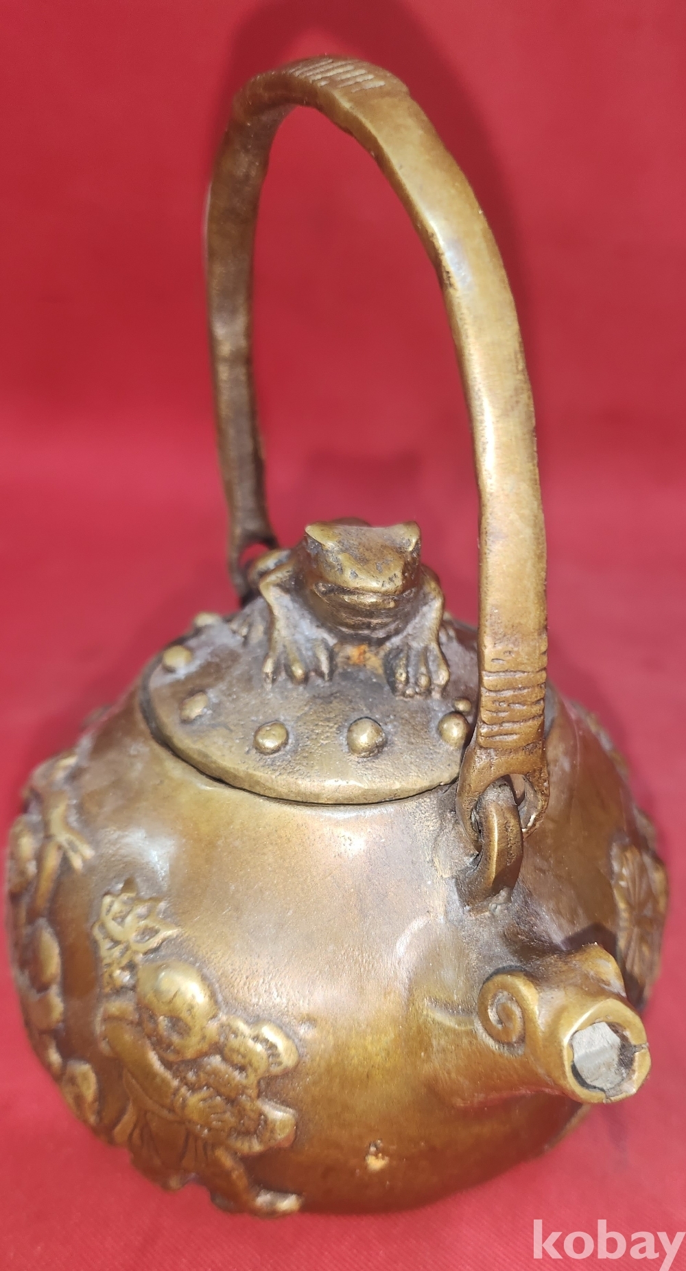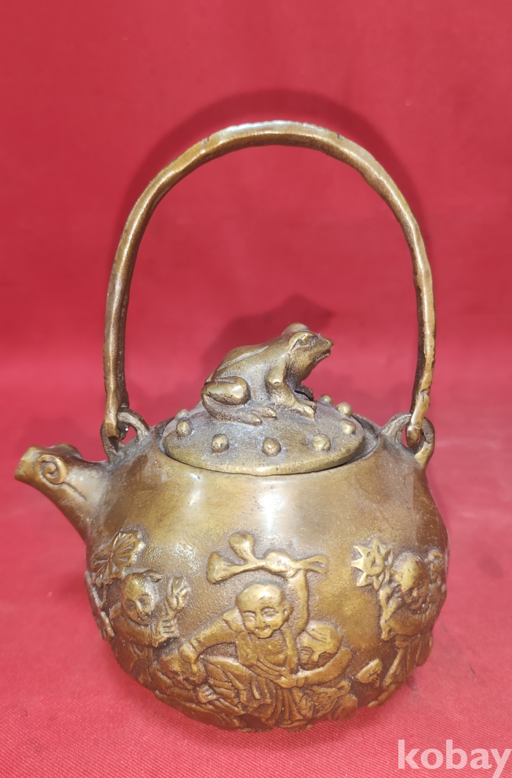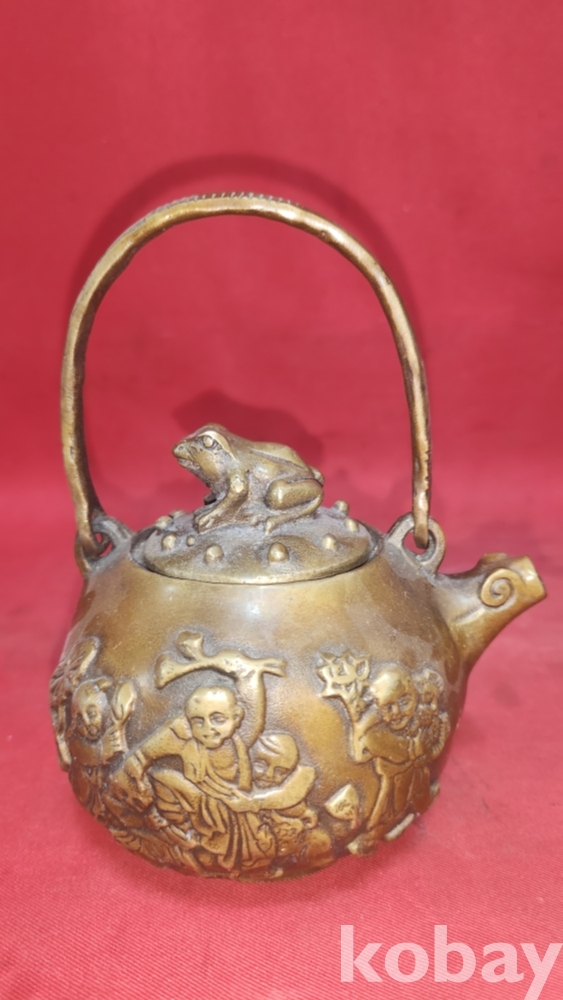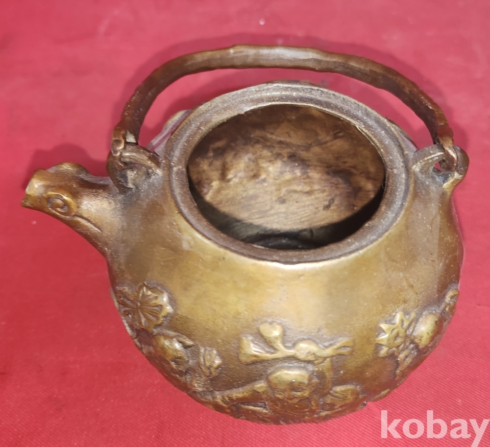 대명선덕(大明宣德) 관지 보이는 적동으로 완성된 오자탈연(五子奪蓮) 문자와 동자문양 주전자입니다,
