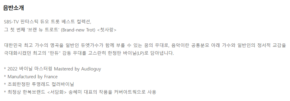 ◆미개봉◆ SBS 판타스틱듀오 트롯 베스트 (첫사랑) LP / 500장 한정