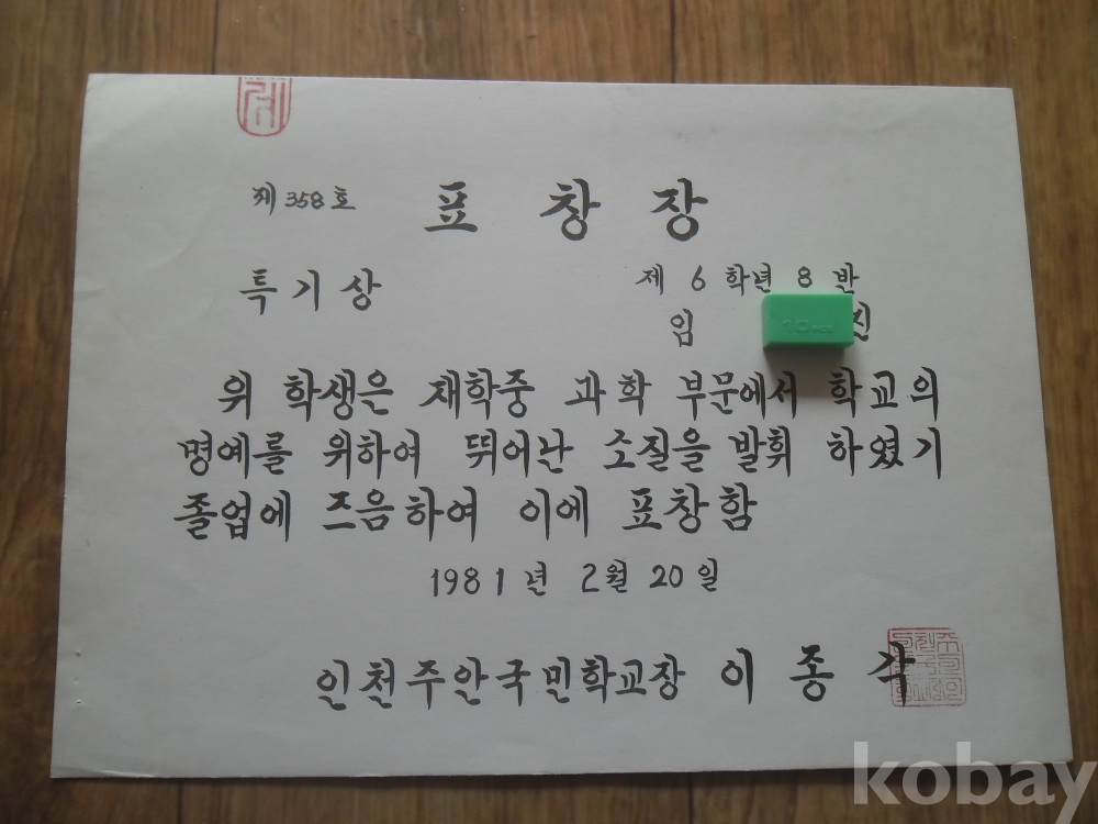 1981년 인천주안국교 특기상 표창장