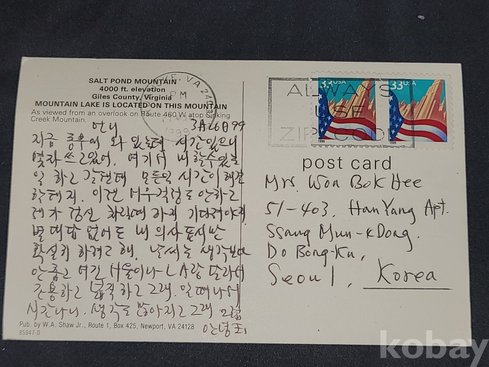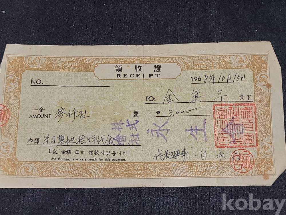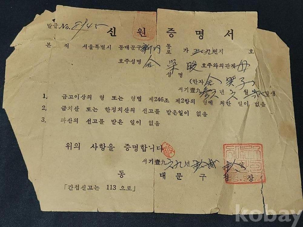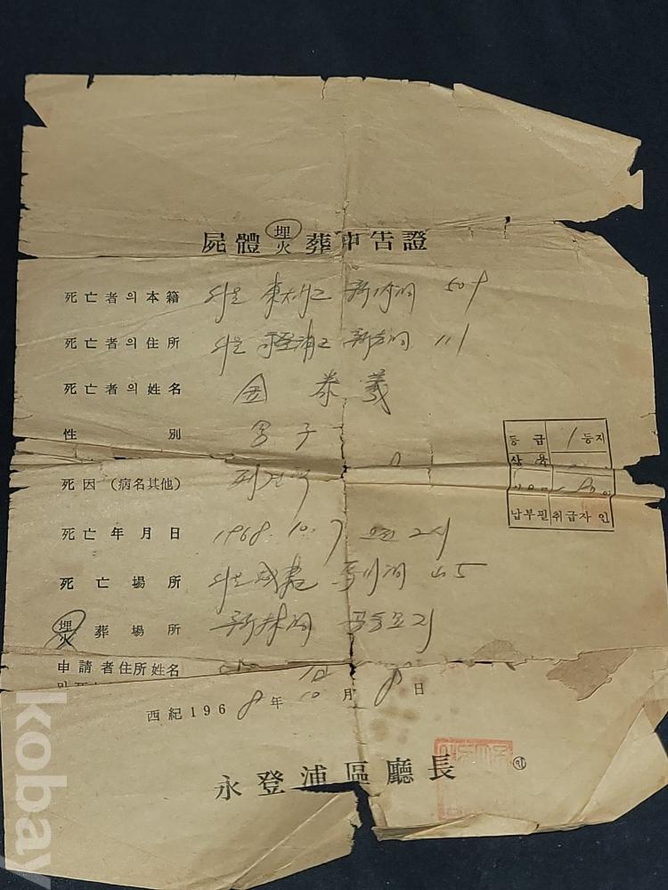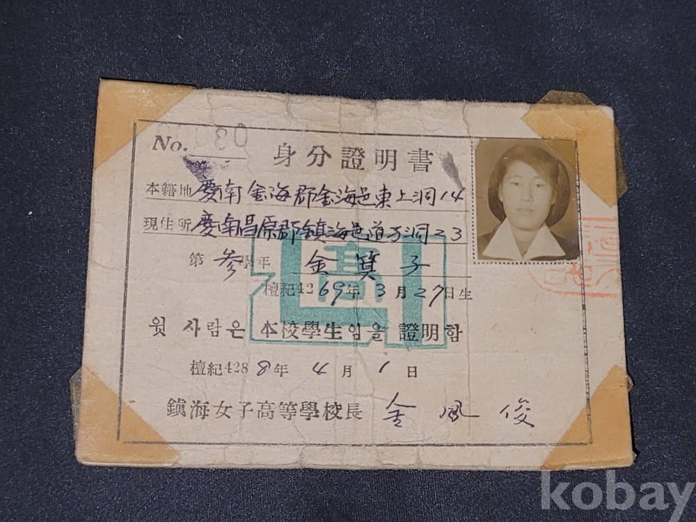 빈티지 1955년 진해여고 학생증, 1968년 대금 영수증, 1985년 미국 이민증, 1968년 매장 신고 증명서, 미국에서 보낸 엽서, 신원 증명서 등 각종 자료 일괄입니다.
