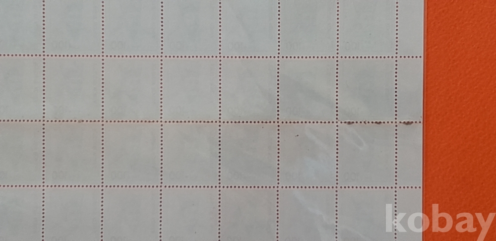 뒷면 아래에서 두번째 줄 오른쪽 천공을 따라 오염된 부분이 있습니다.(두 번째, 세 번째 사진 참조)