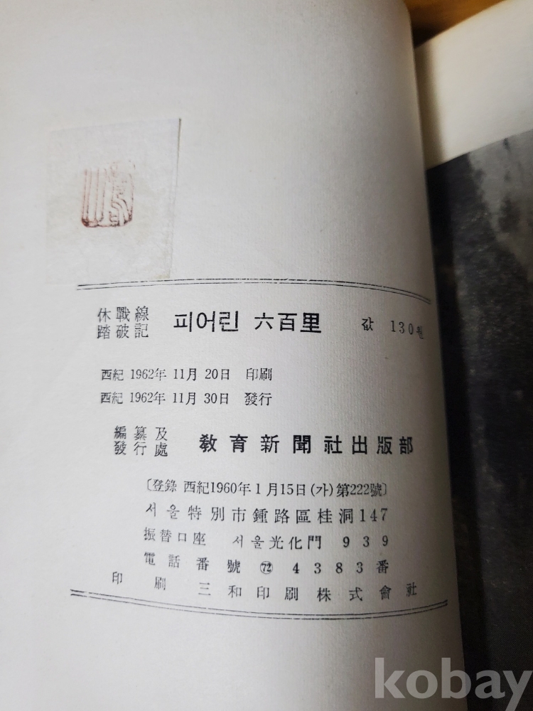 1. 피어린 600리, 이은상, 교육신문사, 1962년, 186쪽, 상태 상, 사진 참조