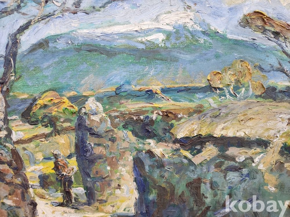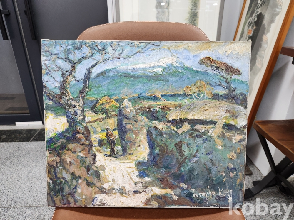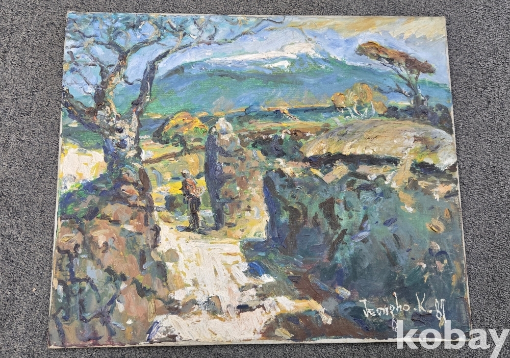 본 작품은 케이옥션에서 꾸준히 주목받는 인기작가이자 ‘서울의 달’ 시리즈로 잘 알려진 서양화가 김정호의 제주 풍경 회화 작품이다. 화면 전경의 길과 돌담, 중경의 마을 풍경, 그리고 후경에 드러나는 한라산의 실루엣이 어우러져 제주 특유의 공간감과 정서를 담아낸다. 거친 붓질과 두터운 색면을 통해 자연의 질감과 현장감을 강조했으며, 구상적 풍경 안에 작가 특유의 리듬감 있는 터치가 살아 있다. 8호(F) 크기의 작품으로 화면 밀도가 높고, 1987년에 제작된 초기작임에도 불구하고 제작연도 대비 보존 상태가 비교적 양호해 감상성과 소장 가치를 함께 갖춘 작품이다.