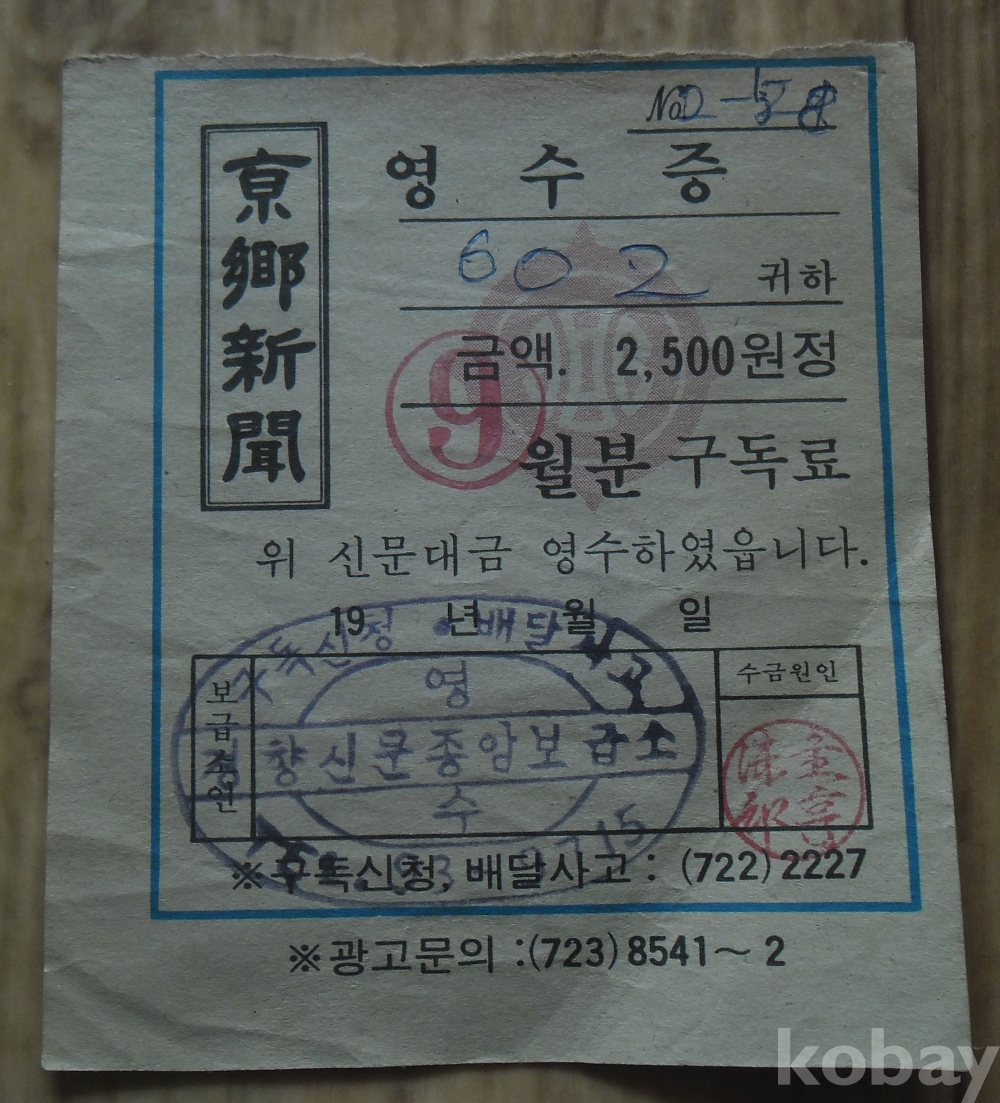 2500원 시기 경향신문 구독료 영수증