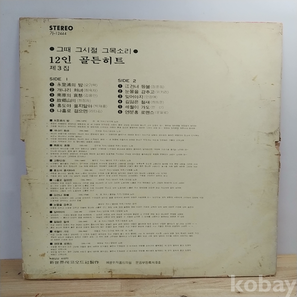 | 자켓상태 | VG : 주름, 접힘, 모서리 찢김 다수 | 음반상태 | VG : 생활 기스 다수, 가벼운 노이즈 존재 | 발매정보 | 초반 | 가사지여부 | 무 |