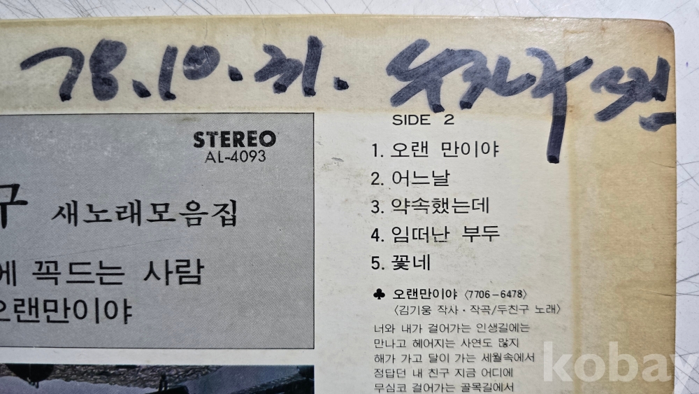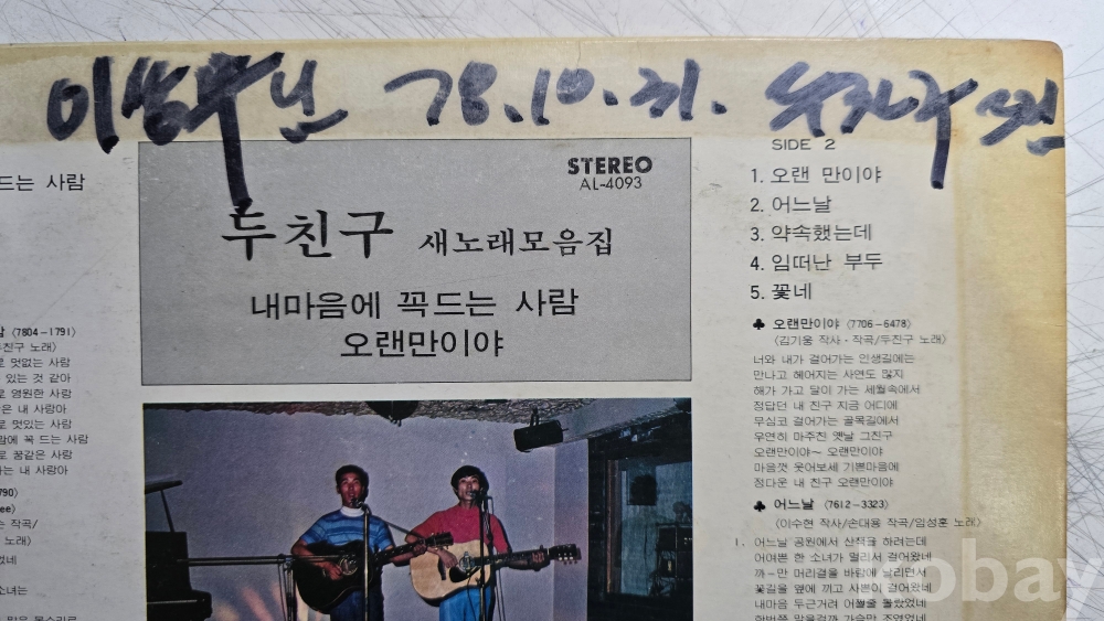 | 자켓상태 | VG : 주름, 접힘, 모서리 찢김 다수 | 음반상태 | VG : 생활 기스 다수, 가벼운 노이즈 존재 | 발매정보 | 초반 | 가사지여부 | 유 |