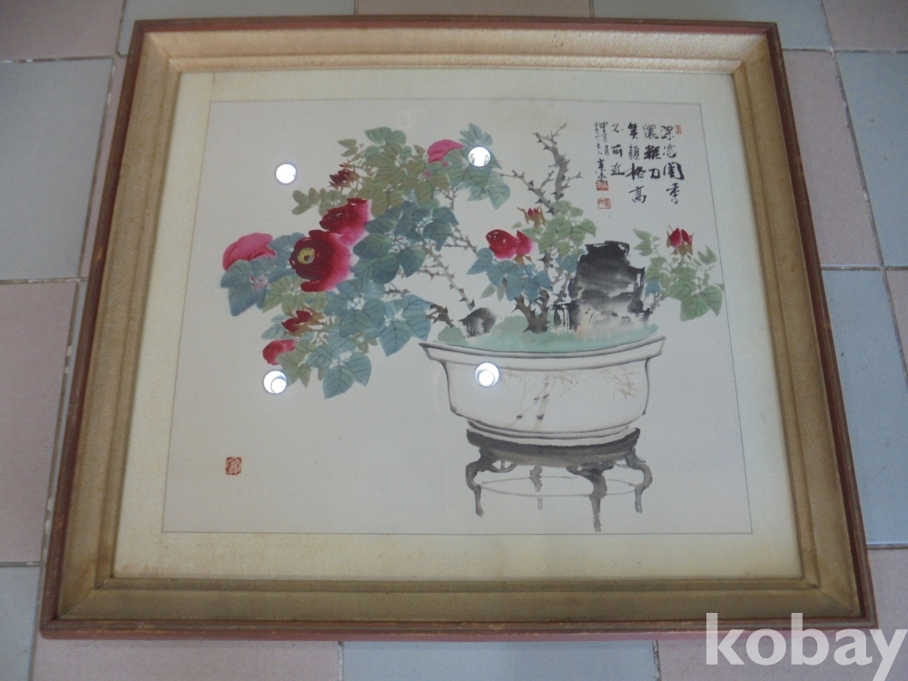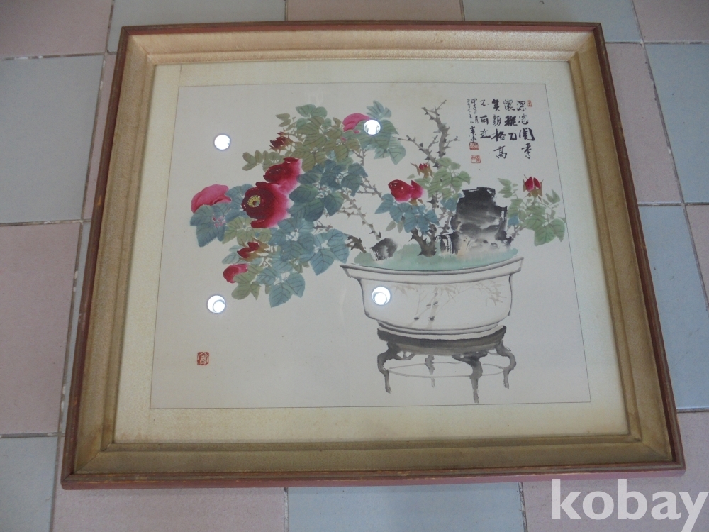 수준높은 사랑방 책거리류그림으로 화가명 소걸 격이높은 흔치않은 사랑방 기명 괴석장미분재 그림액자