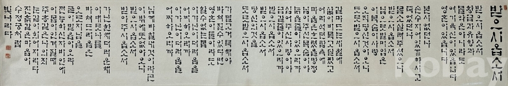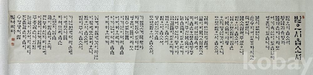 본 작품은 불교 경전인 반야심경 내용을 한글 음역 형태로 서사한 서예 작품으로, 세로열 배열 방식의 전통 구성과 안정적인 필획 리듬이 특징이다. 전체 화면은 경전 낭독용 구성에 맞춰 균형감 있게 배치되어 있으며, 먹색의 농담 변화와 획의 속도감이 자연스럽게 조화를 이루고 있다. 종이 바탕에는 보관 과정에서 발생한 자연스러운 세월감과 접힘 자국이 일부 존재하나 전체 판독에는 지장이 없으며, 종교 공간 장식용, 명상 공간 인테리어, 컬렉션용 서예 작품으로 활용 가치가 충분하다. 액자 제작 시 족자 또는 병풍형 연출이 가능한 대형 규격 작품이다.