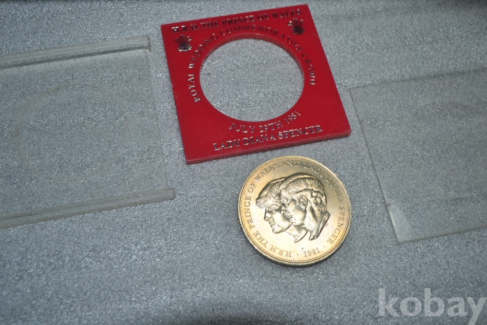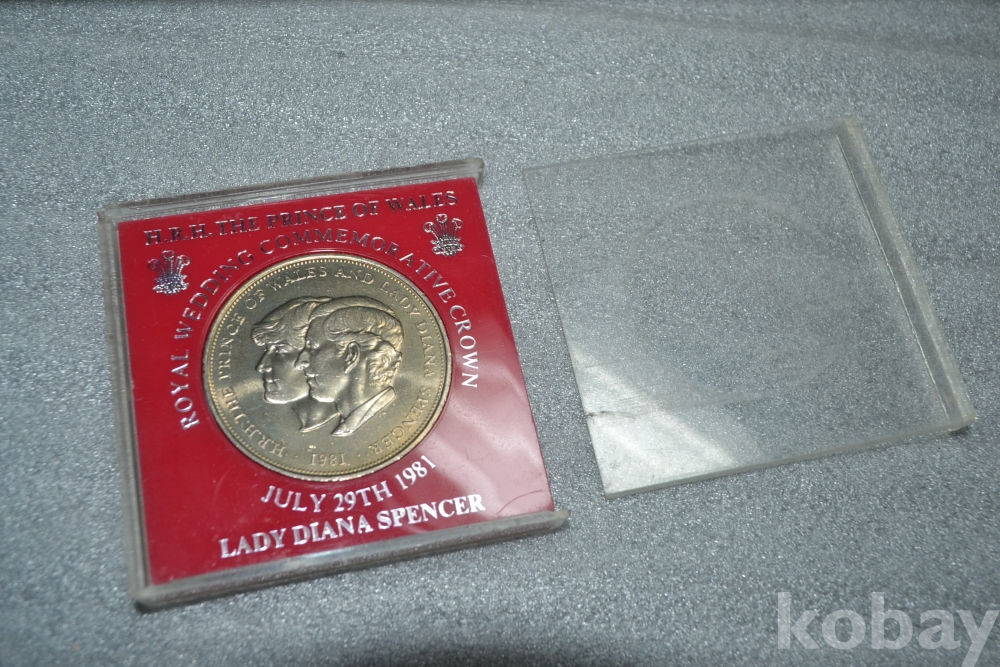 케이스에 두꺼운 붉은색 아크릴판에는 영어로 " 황태자 다이아나, 왕실 결혼기념 " 으로 은색글씨가 표기되어져 있습니다. (사진참조)