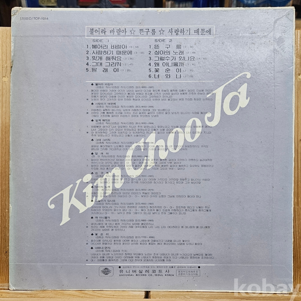 신중현 사단의 대표 여가수인 김추자 가수님께서 1980년에 김희갑 / 김중순 선생님 작품집으로 발매된 신곡집 입니다. 불어라 바람아 노래가 히트되었으며 그외에 상아의 노래등 여러 명곡이 많습니다.
