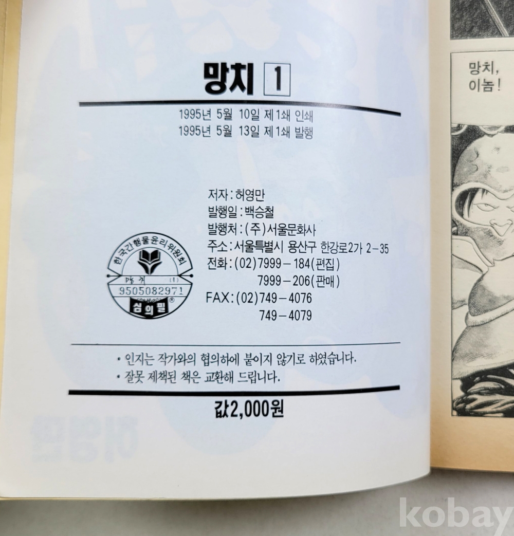 물 품 명 | 미사용 / 허영만 / 망치(2) : 1~6완결 총6권 / 아이큐점프코믹스 / 1995년 초판 / 서울문화사 |