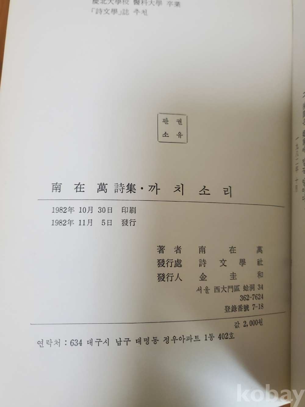 1. 까치소리, 남재만, 시문학사, 1982년, 110쪽, 상태 상, 사진 참조
