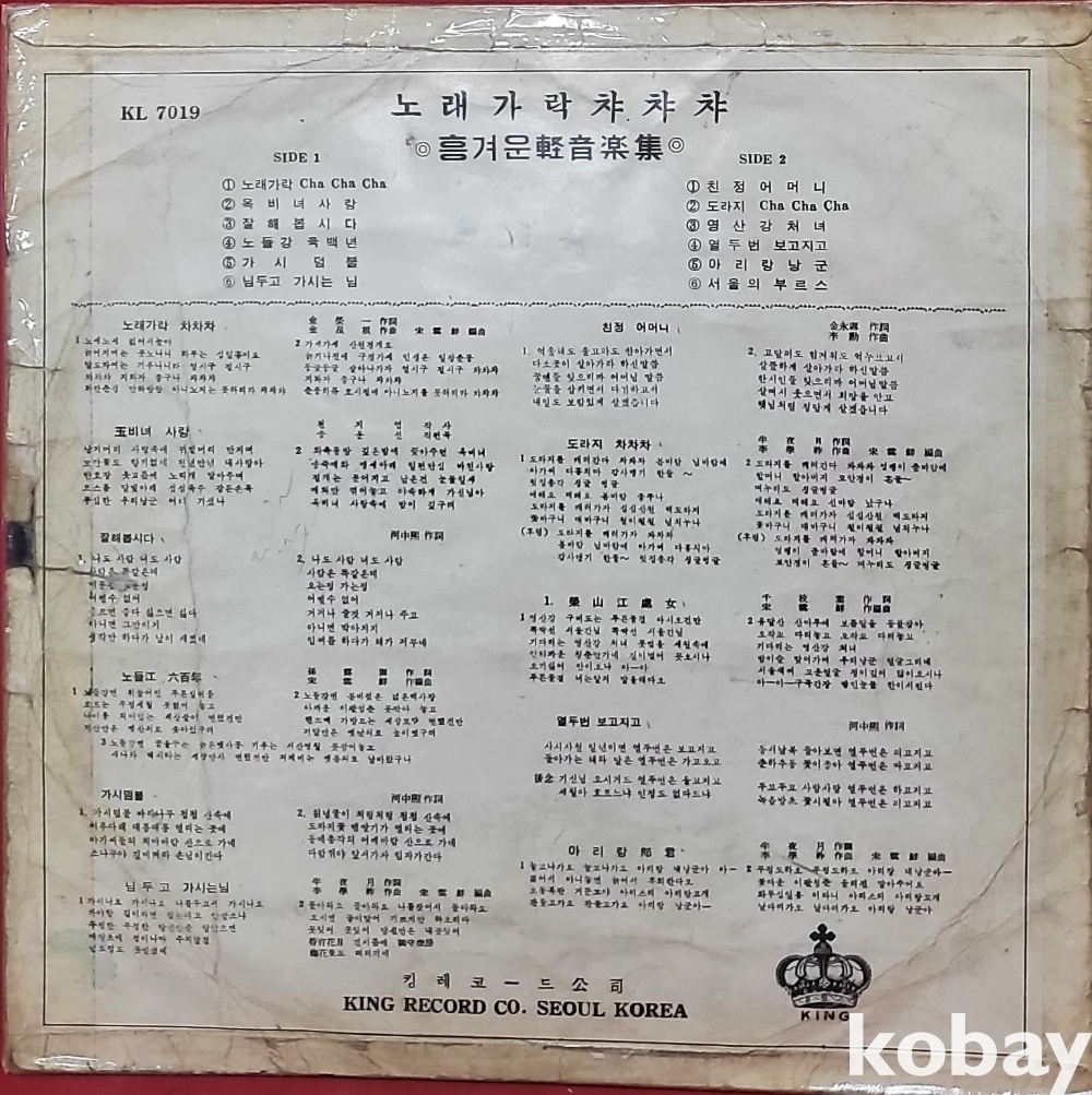 | 자켓상태 | EX : 약간의 마모, 모서리 찢김 존재 | 음반상태 | VG : 생활 기스 다수, 가벼운 노이즈 존재 | 발매정보 | 알수없음 | 가사지여부 | 유 |