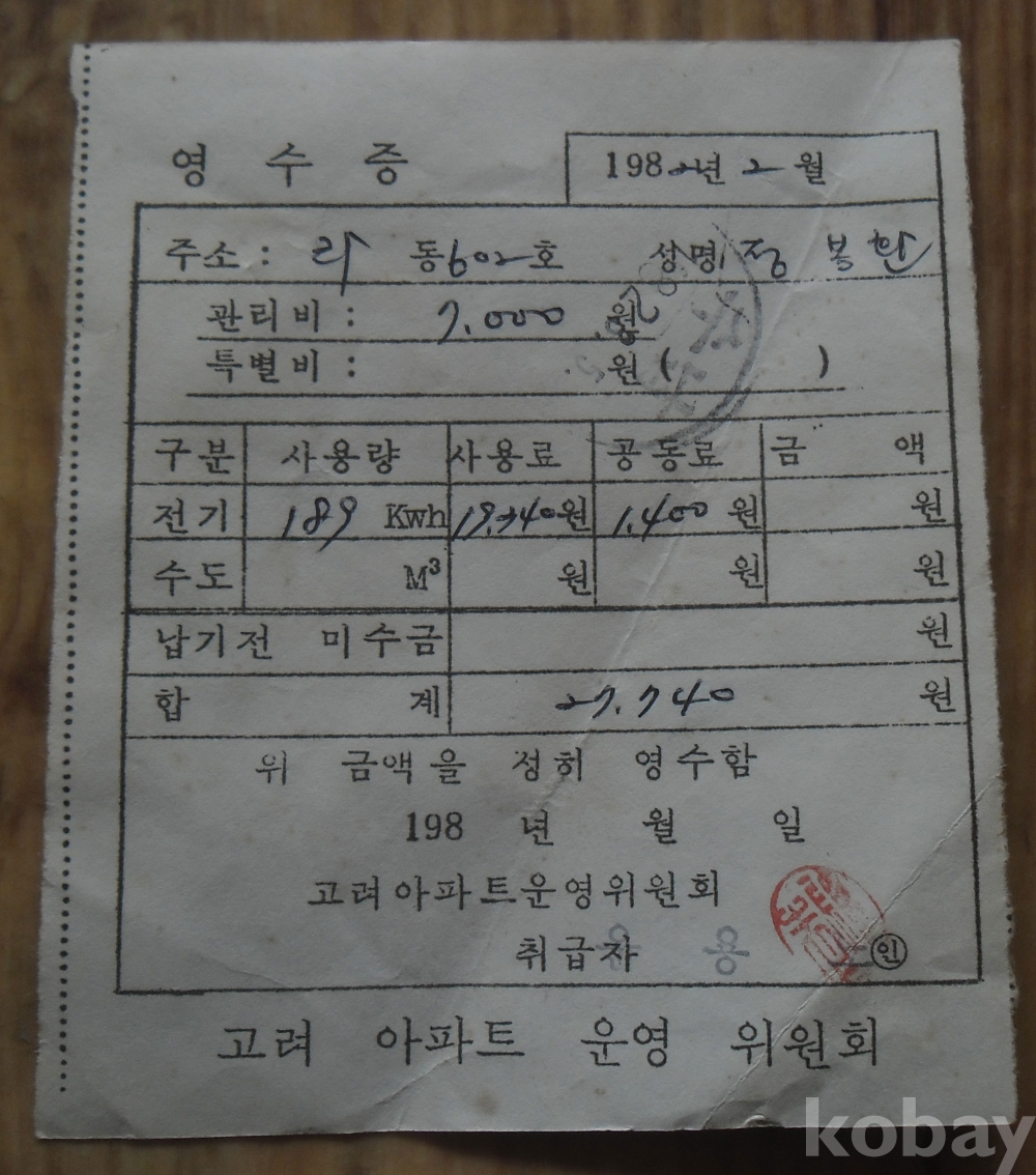 1982년 고려아파트 전기료 영수증